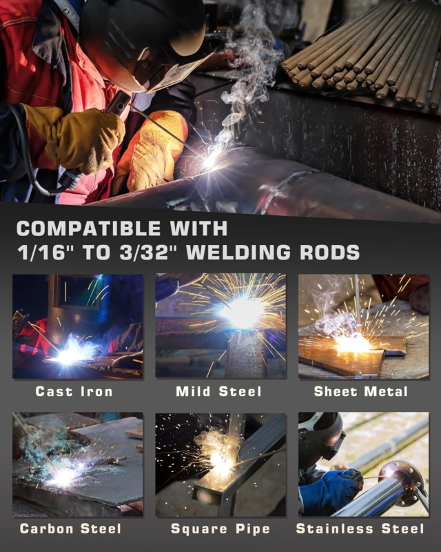 ?200A Stick Welder?The adjustable current of 20-200A can meet your welding needs. Compatible with 1/16''-5/32'' welding rods, we provide 5pcs 3/32'' welding rods. Suitable for welding iron, carbon steel, and stainless steel. Perfect for home DIY, maintenance and repair of farm, garden or garage.