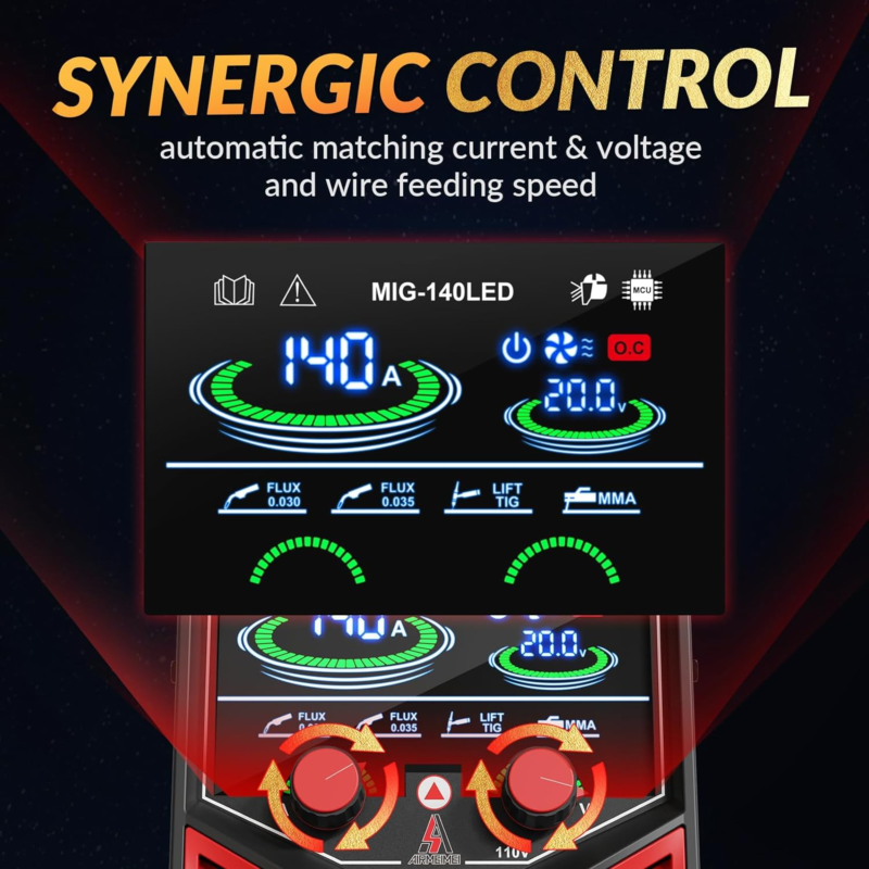 ?Synergic Design Easy to use ? The Mig welder 110v with Synergic Control design,automatic matching current(20-130A) voltage(90-140V), and wire feeding speed. The mig welder is easier for beginners or those who are learning to weld and want to make small repairs around the house.