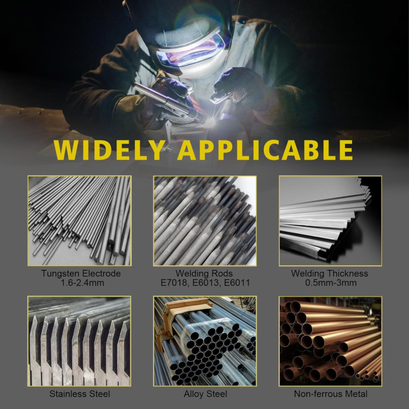 ?Wide Application?The TIG welding machine handles stainless steel, alloy steel, low-carbon steel, copper, iron, etc. DC LIFT TIG welds 0.5mm-3mm metal thickness (excluding aluminum), while the ARC function suits 0.3mm-2mm metal sheets.
