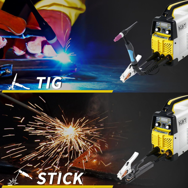 ?2 IN 1 Welder?HEY UP TIG200 TIG welder supports both arc welding and LIFT TIG welding. 1.6-3.2mm E7018, E6013 and E6011 welding rods are available for ARC welding. LIFT TIG welding is compatible with the included WP-17 TIG torch for 1.6MM-2.4MM tungsten electrodes, supports spot welding, and ensures easy arc initiation. Perfect for beginners and professional welders.