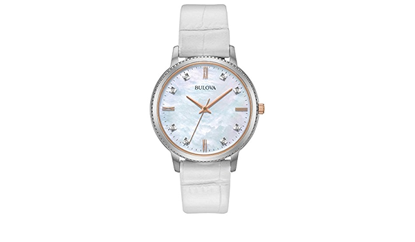 Elevate your style with this stunning Bulova Diamond Dial Watch. The watch features a polished stainless steel case with a crystal bezel and a white mother of pearl dial adorned with diamond markers. Its 12-hour dial and quartz movement ensure accurate timekeeping, while the water-resistant design adds durability and convenience. The watch comes with a luxurious white leather bracelet strap, making it a perfect accessory for both formal and casual occasions.