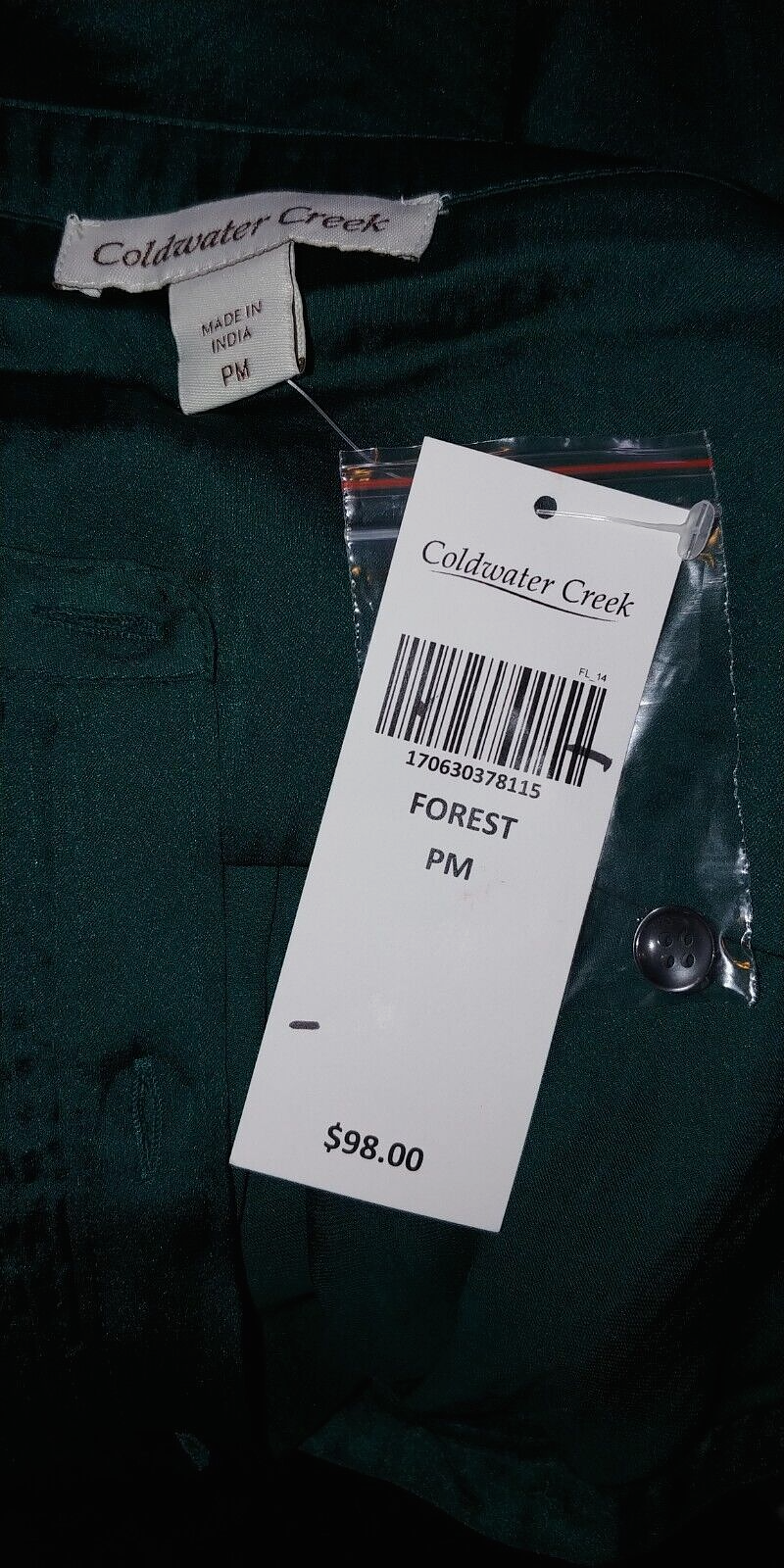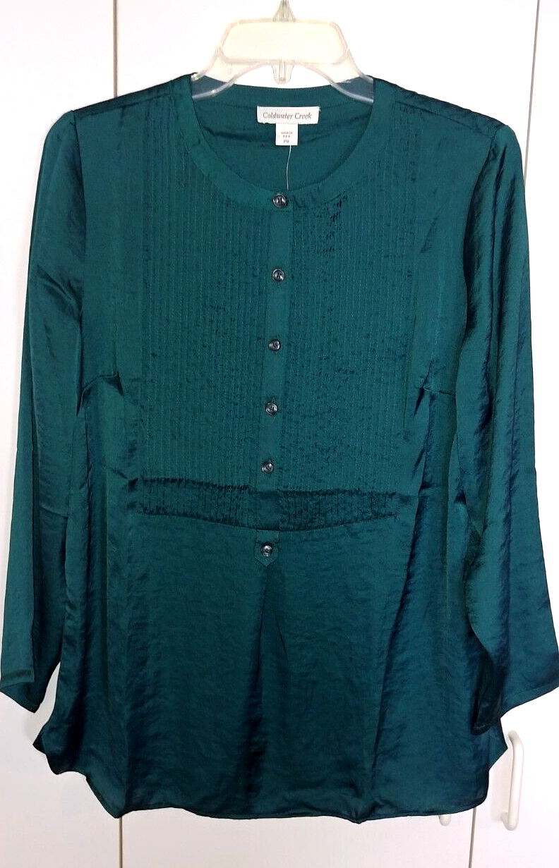 THIS IS A LOVELY LADIES COLDWATER CREEK LONG-SLEEVED FOREST GREEN PULLOVER SILKY POLYESTER TOP IN A SIZE PM. IT IS NEW, WITH TAGS ATTACHED AND AN ORIGINAL PRICE TAG OF $98.