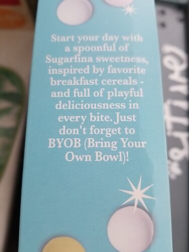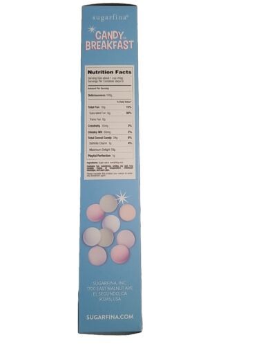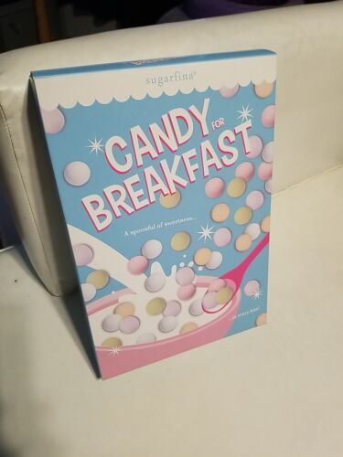 Unique Sugarfina Candy Cereal Box display piece from launch of their candy bar/breakfast cereal mashup. Box is empty and was only a store display item. There are a few creases in the cardboard so look closely at the photos. Same size as real cereal box. Whimsical display item for your kitchen. Measures 12 3/4" x 8 1/2" x 21/4" All sales final.