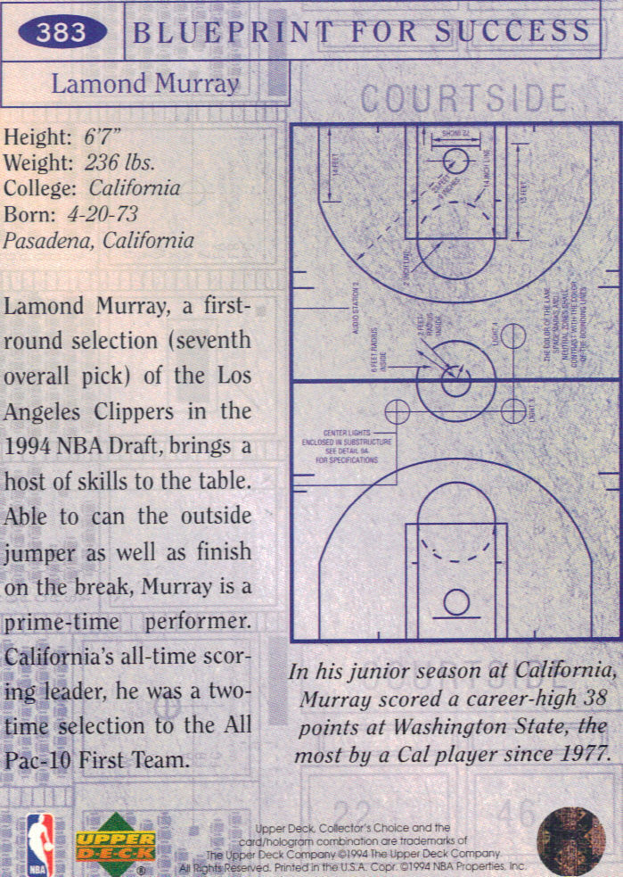 G) 1994-95 Upper Deck Collectors Choice Card Lamond Murray #383 Clippers
