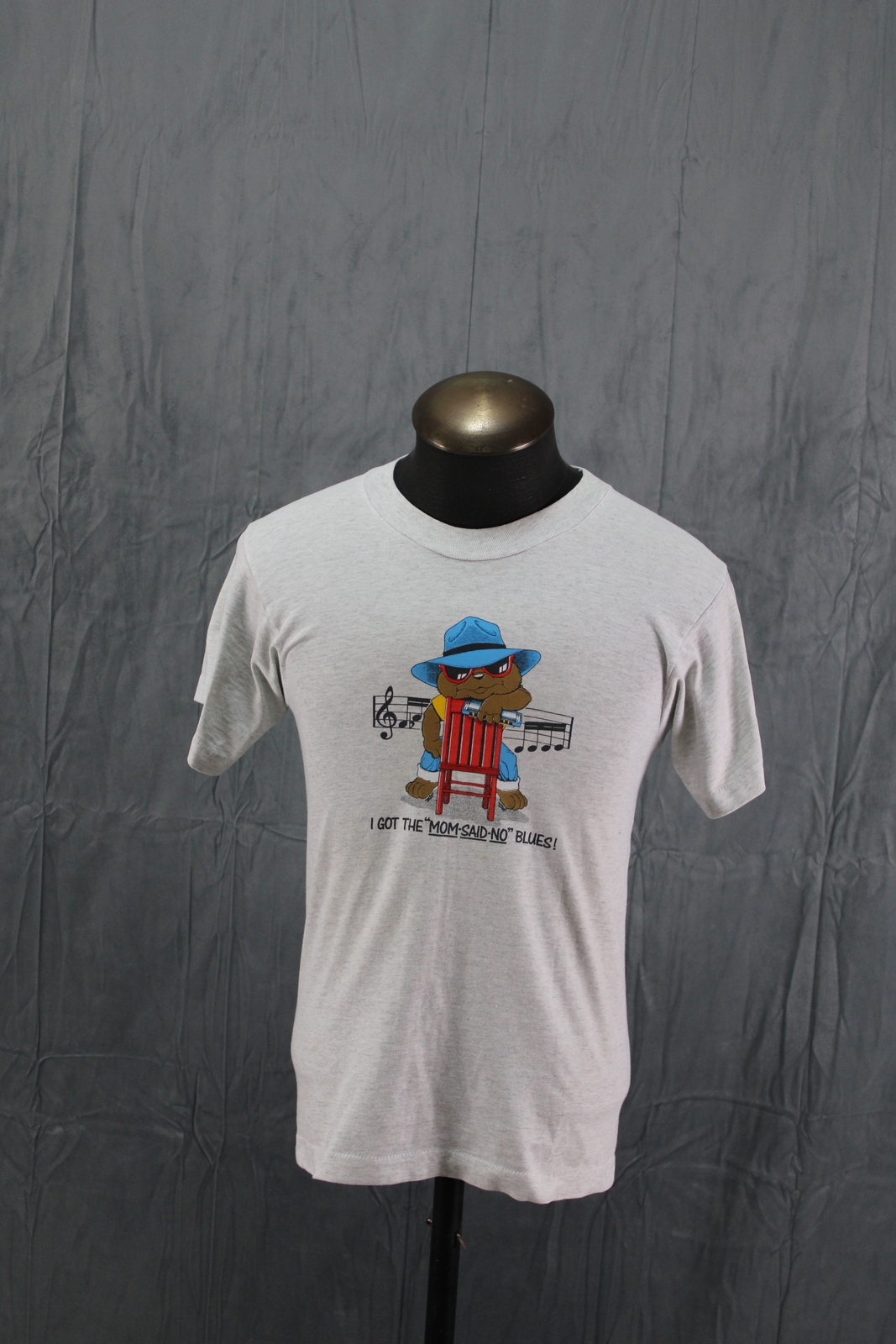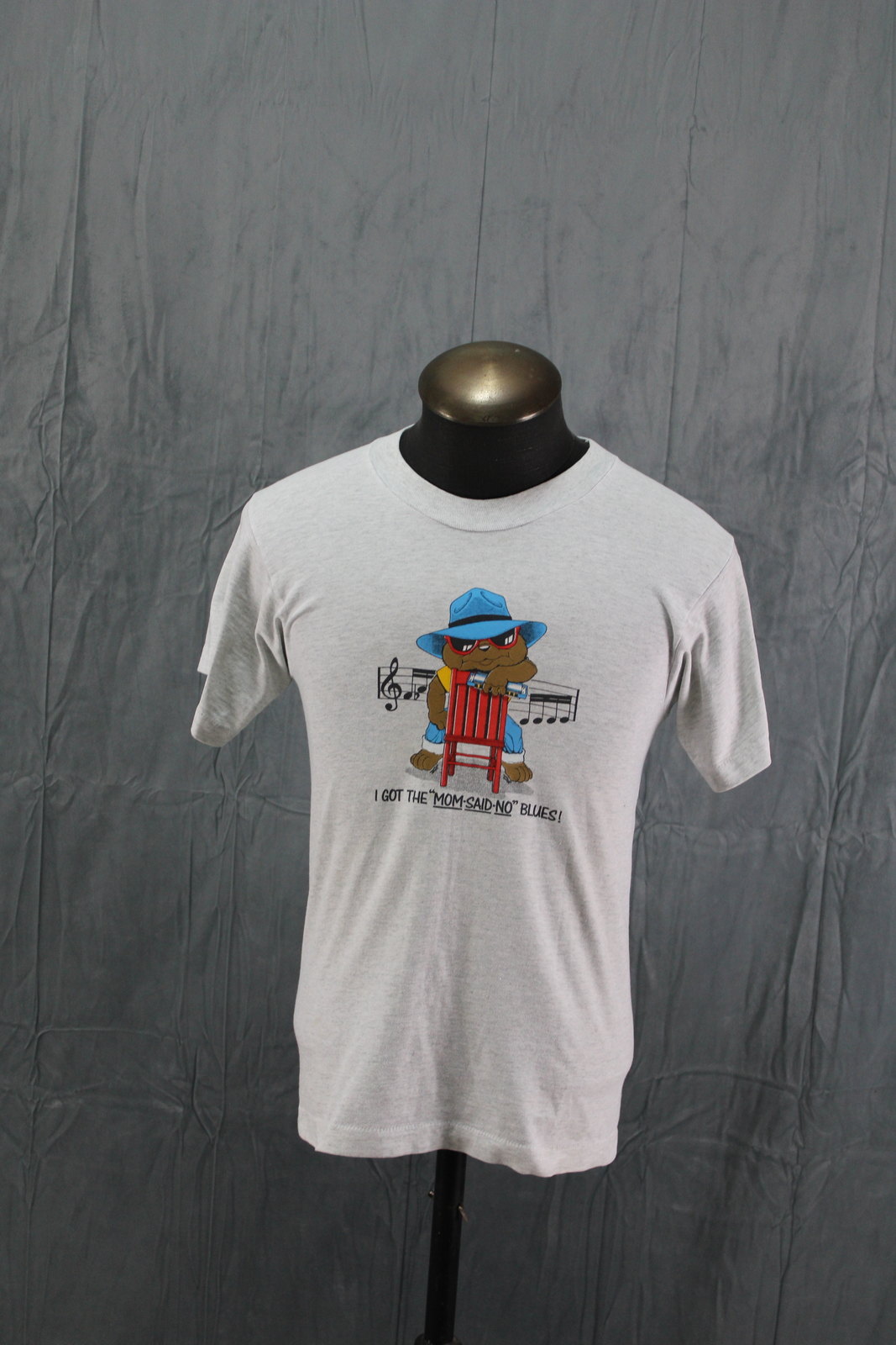 Up for sale is a vintage graphic t-shirt. It has a grey base colour. The graphic is screened on the front of shrit and features a graphic of a teddy bear dressed up as blues singer with a I have the mommy said no blues underneath the graphic. What a great vintage shirt do not miss out on it.
