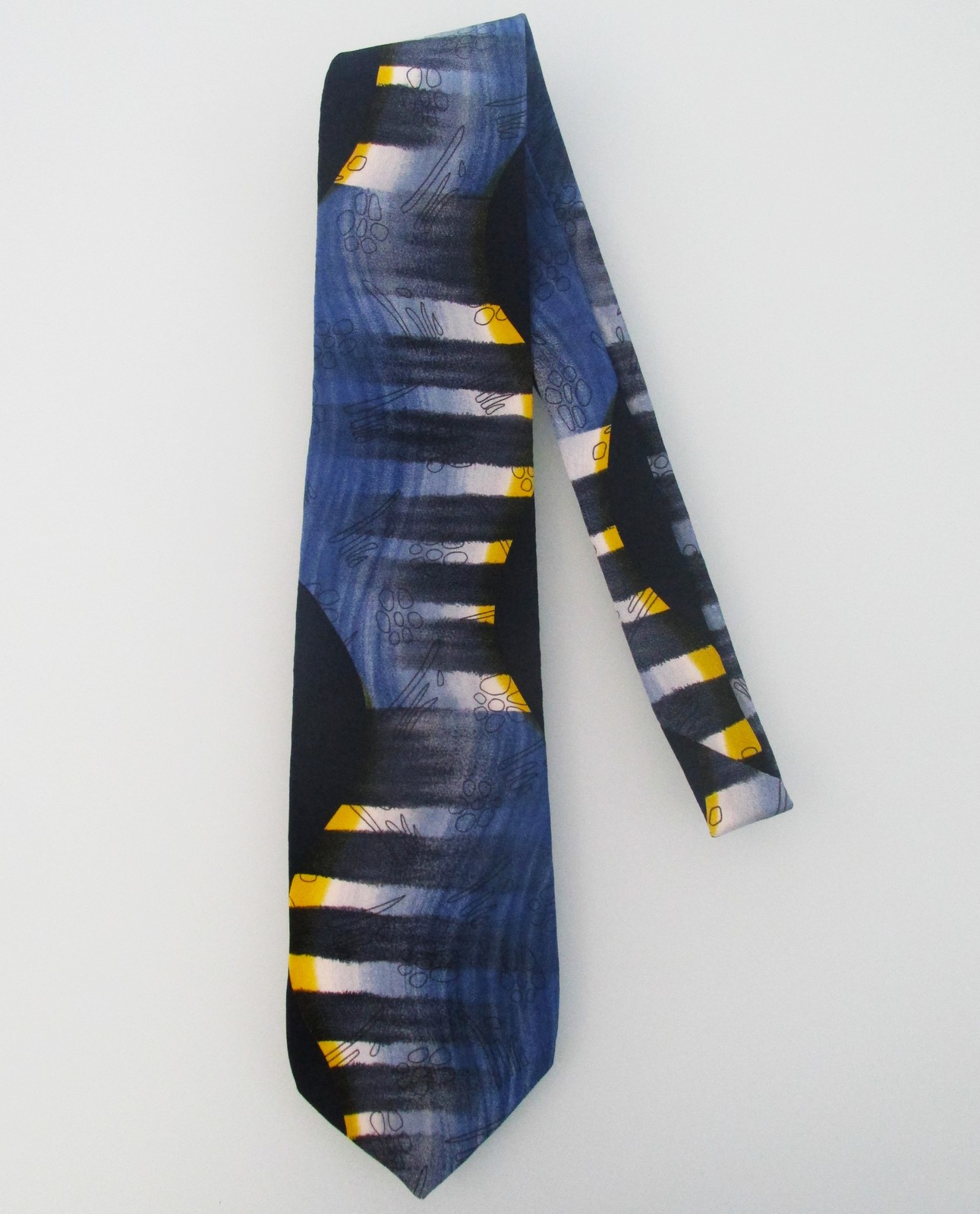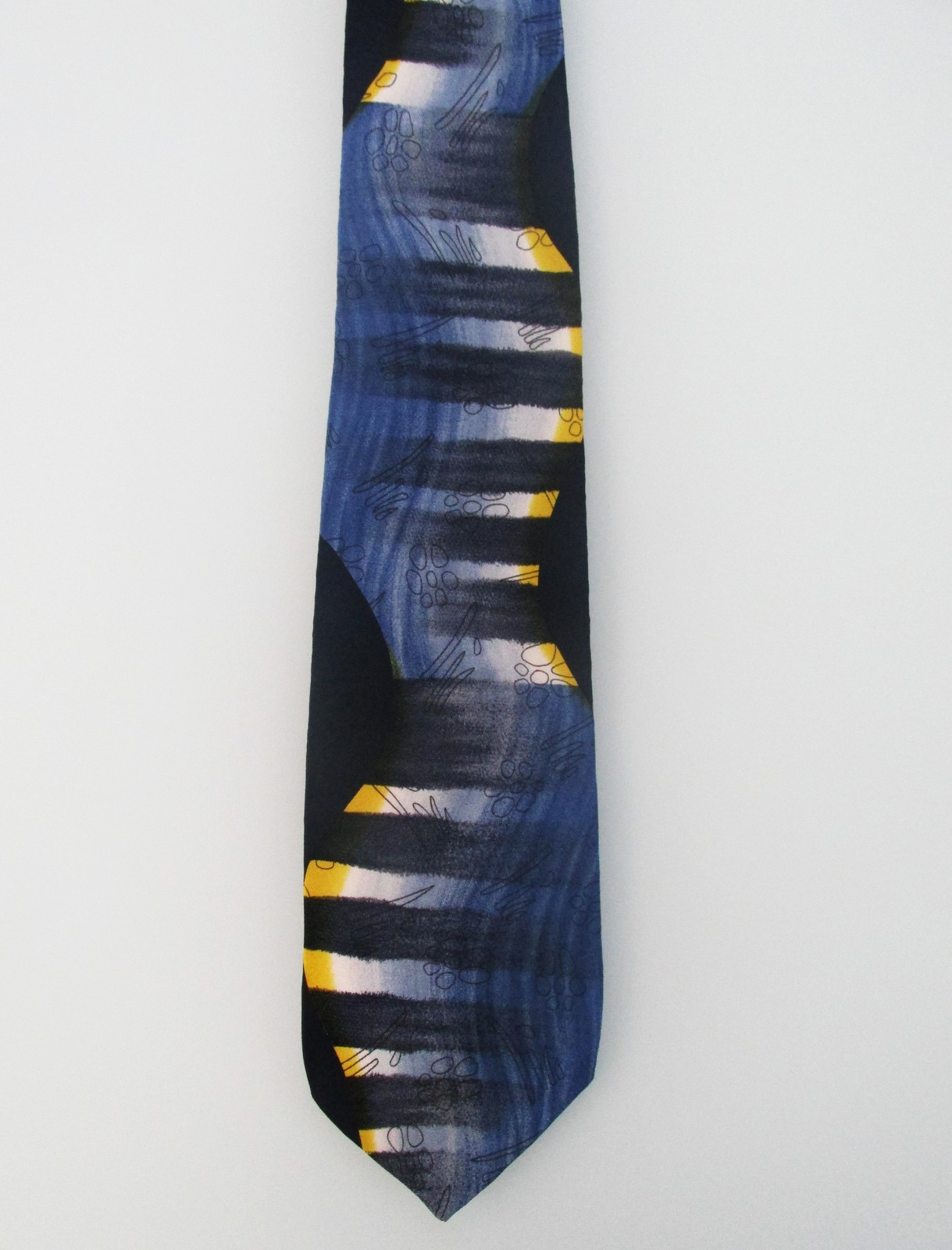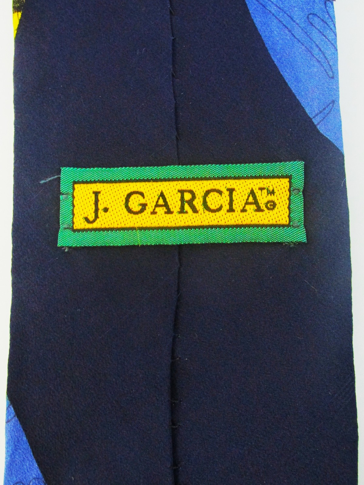 Description: Up for sale is a J. Garcia vintage/early men's silk tie. If you are a fan of these ties then this tie is just what you need to add to your wardrobe. It is handmade in the USA of 100% silk. Dimensions are approximately 56" x 3 5/8". The tie has a multicolored bold abstract design in shades of blue, yellow, black, and gray. Please see the photos for a more accurate depiction of the print and color. This tie is in excellent condition.