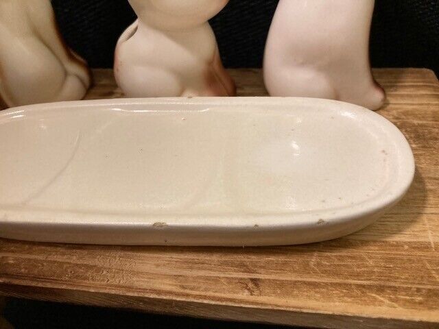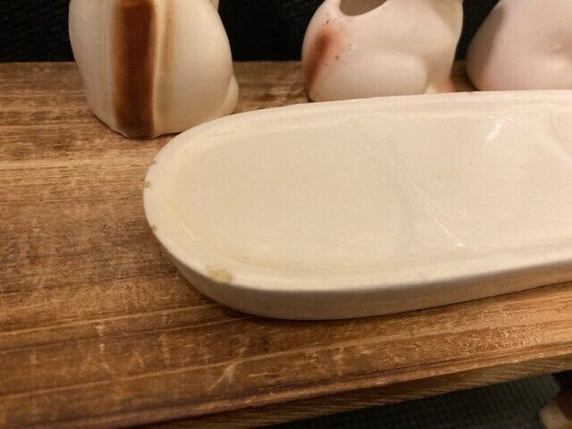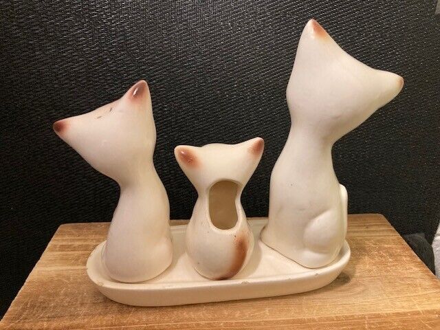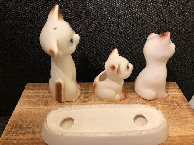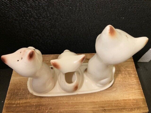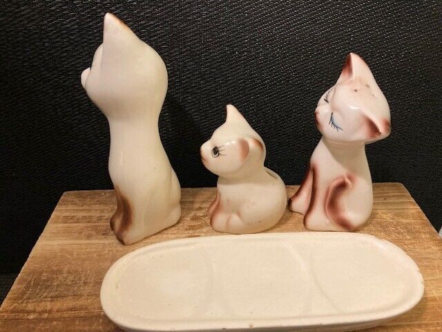 Vintage Ceramic Siamese Cat Salt Pepper Shakers Toothpick Holder Set On Tray Overall very good. Some signs of age. A few small chips on edge of tray. Please refer to images.