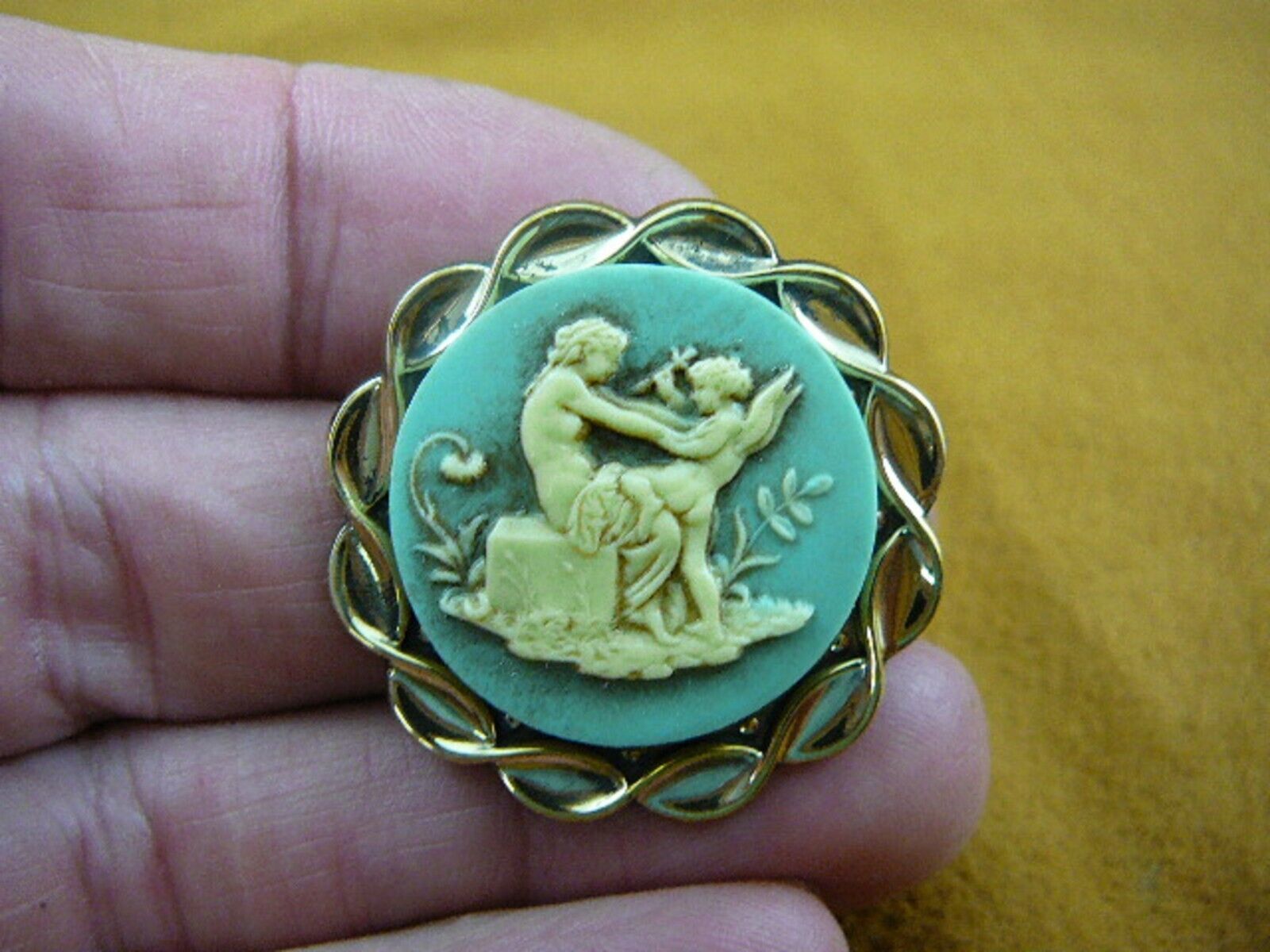 (Internal #CS61-9) Excellent, new, hand stained natural pine resin, hand-molded (reproduced from the original - cameo) cameo of a CHERUB CUPID with ARROW getting on a WOMAN'S LAP. Pin/pendant in OFF-WHITE colored pine resin with LIGHT BLUE background is mounted on - - brass; cameo itself is 1" diameter. Clasp pin/pendant glued on back horizontally.