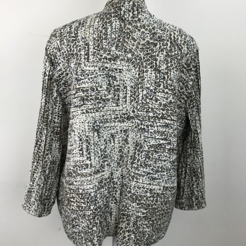 This is a beautiful zip front jacket in excellent condition. Outer fabric is cotton strips on mesh, really cool fabric. When I say cool I mean bothe way, yes lightweight cool but also very interesting, see close up pictures of outside and inside.