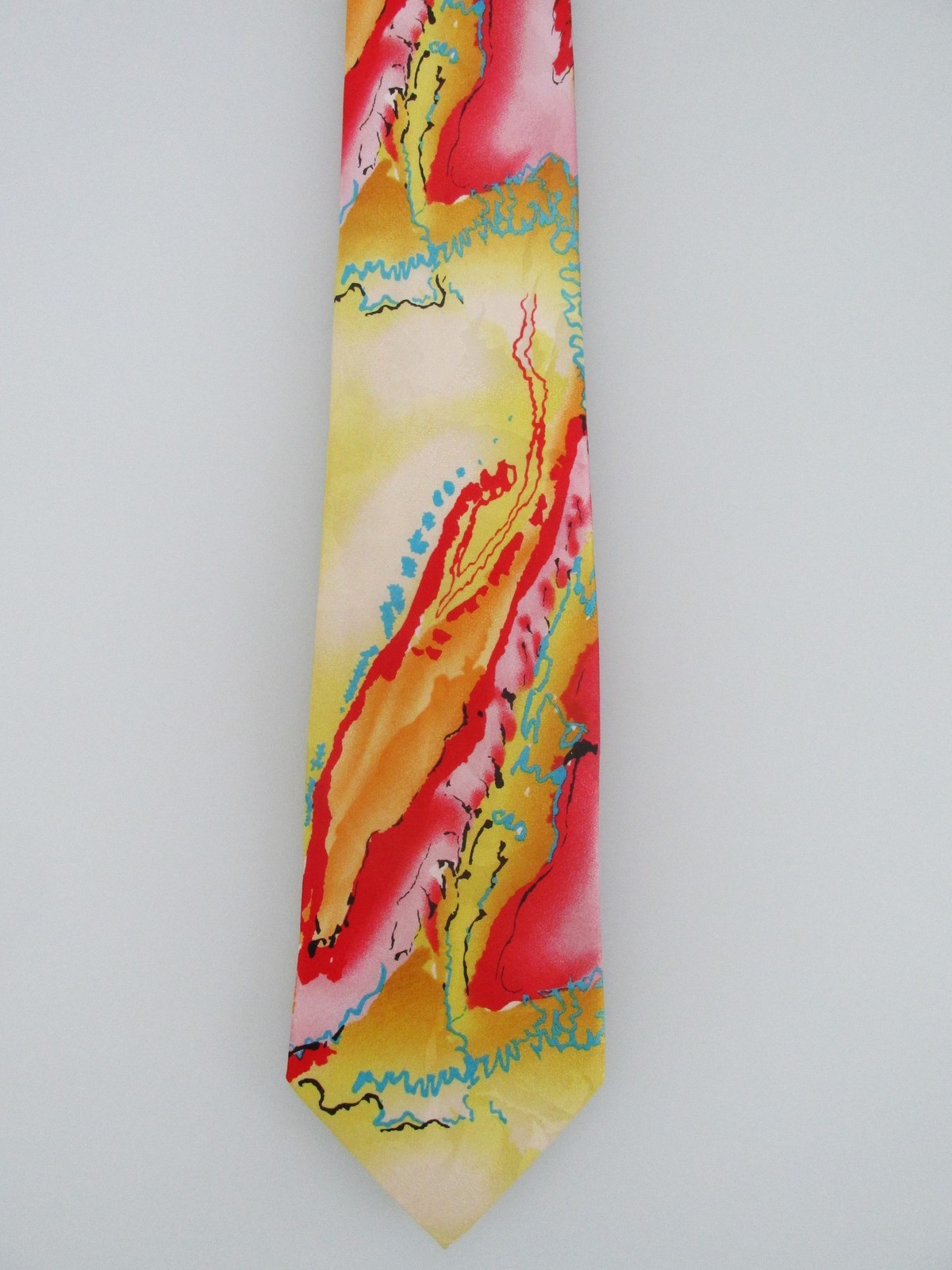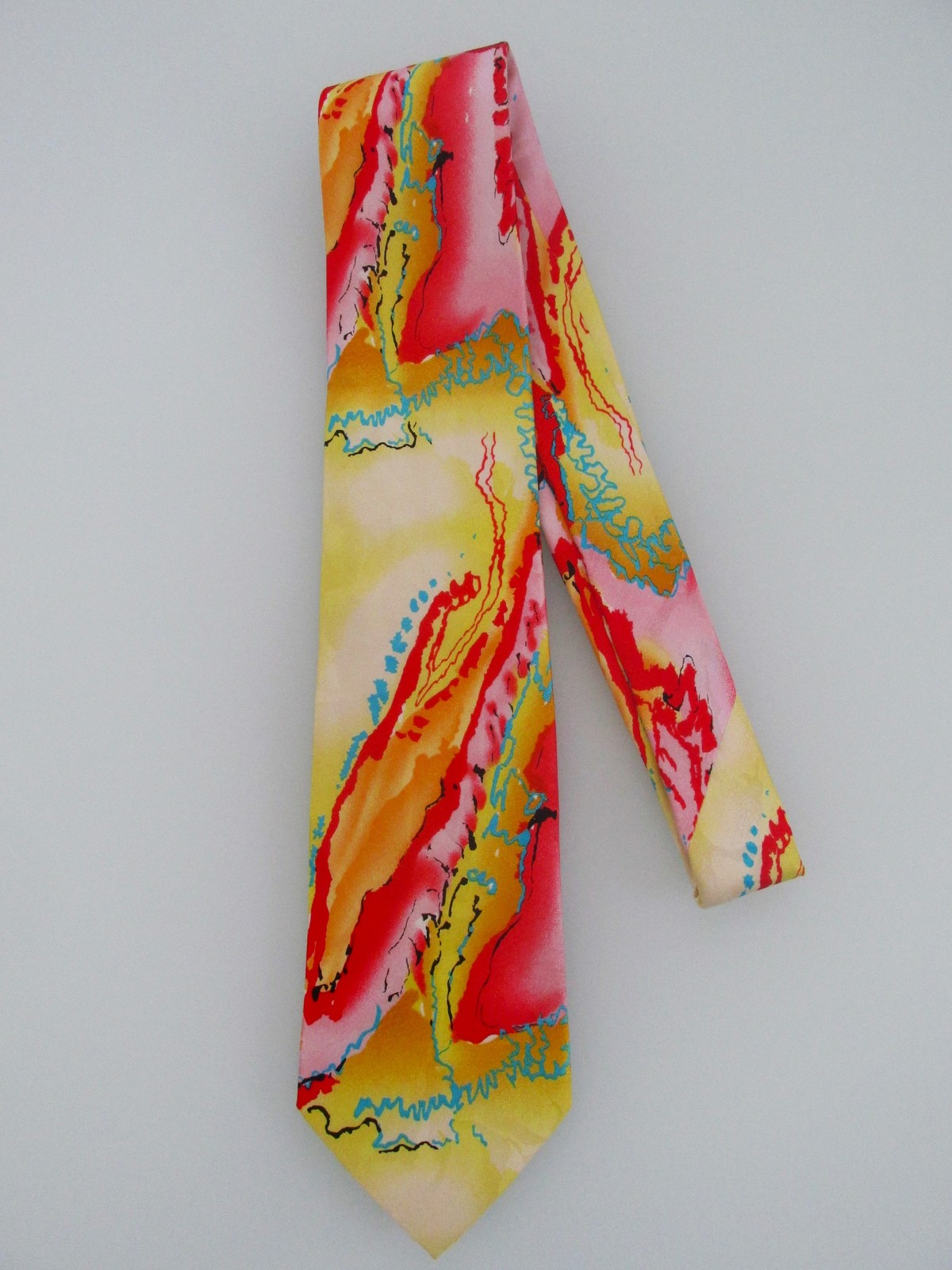 Description: Up for sale is a J. Garcia men's silk tie. If you are a fan of these ties then this tie is just what you need to add to your wardrobe. It has a bold and colorful abstract print and is made of 100% silk. Dimensions are approximately 58" x 3 5/8." Please see the photos for a more accurate print and color representation. This tie is in excellent condition