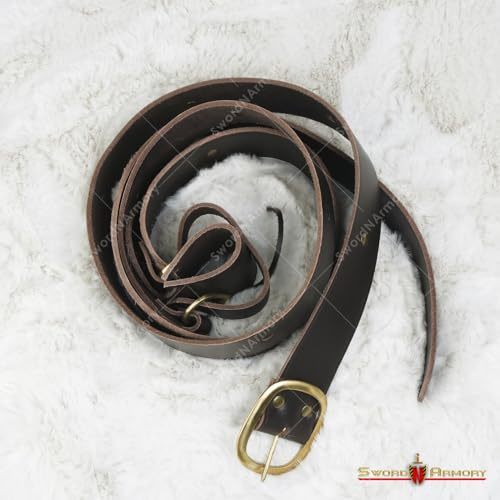 The belt was a vital component to medieval garments and armor, keeping disparate pieces together, as well as providing a platform on which to hang drinking horns and skins, weapons, quivers, bags, and purses. This particular model is a fine brown genuine leather piece, double-wrapped for extra support when hanging swords from it. Armor up, and complete your reenactment outfit with this versatile belt! [Dimensions] 81?x1.5? [Materials] The genuine leather and brass buckle each lend this belt an authentic look and feel [Double Wrap] Provides extra support for weapons, without sagging the rest of the belt [Sword Frog] Adjustable to fit most scabbards [Quality] All of our products are made of the finest materials, and are packaged securely in our own warehouse