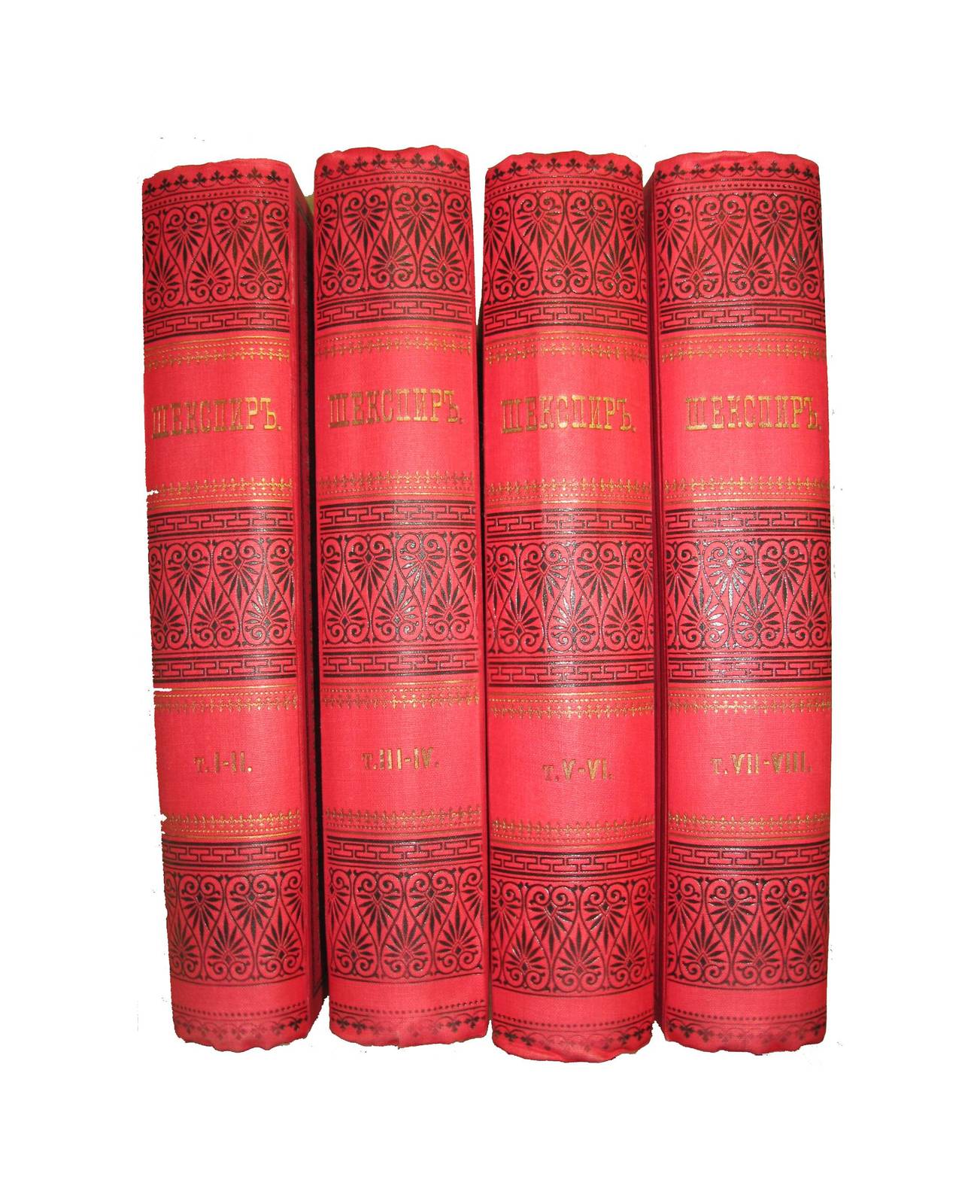 In Russian. Short description: ?. I. Storozhenko, Shakespeare in the Translation and Explanation by A. L. Sokolovsky (Complete Works in 8 Volumes in 4 Books), Published by A. F. Marx, 1894-1898. The first edition of Shakespeare's collected works in Russian translation appeared in 1841, translated by N. Ketcher. In 1865-1868, N. A. Nekrasov and N. V. Gerbel published their own version of Shakespeare's works. For this edition, they invited the then relatively unknown translator Alexander Lukich Sokolovsky. He translated twelve plays for this edition. Sokolovsky became so engrossed in the work that it became a lifelong endeavor for him. Later, Sokolovsky was involved in the publication of works by Byron, Goethe, and Hoffmann. In the 1870s, A. L. Sokolovsky returned to his long-standing idea of producing a complete Russian translation of Shakespeare on his own. "Shakespeare in the Translation and Explanation by A. L. Sokolovsky" was published in 1898 in 8 volumes. The translation is accompanied by extensive historical and critical essays on each play and numerous explanatory notes. This edition received high praise from contemporaries. In 1901, the Petersburg Academy of Sciences awarded Sokolovsky the complete Pushkin Prize. Please feel free to contact us for a detailed description of the copies available. SKUMS001835