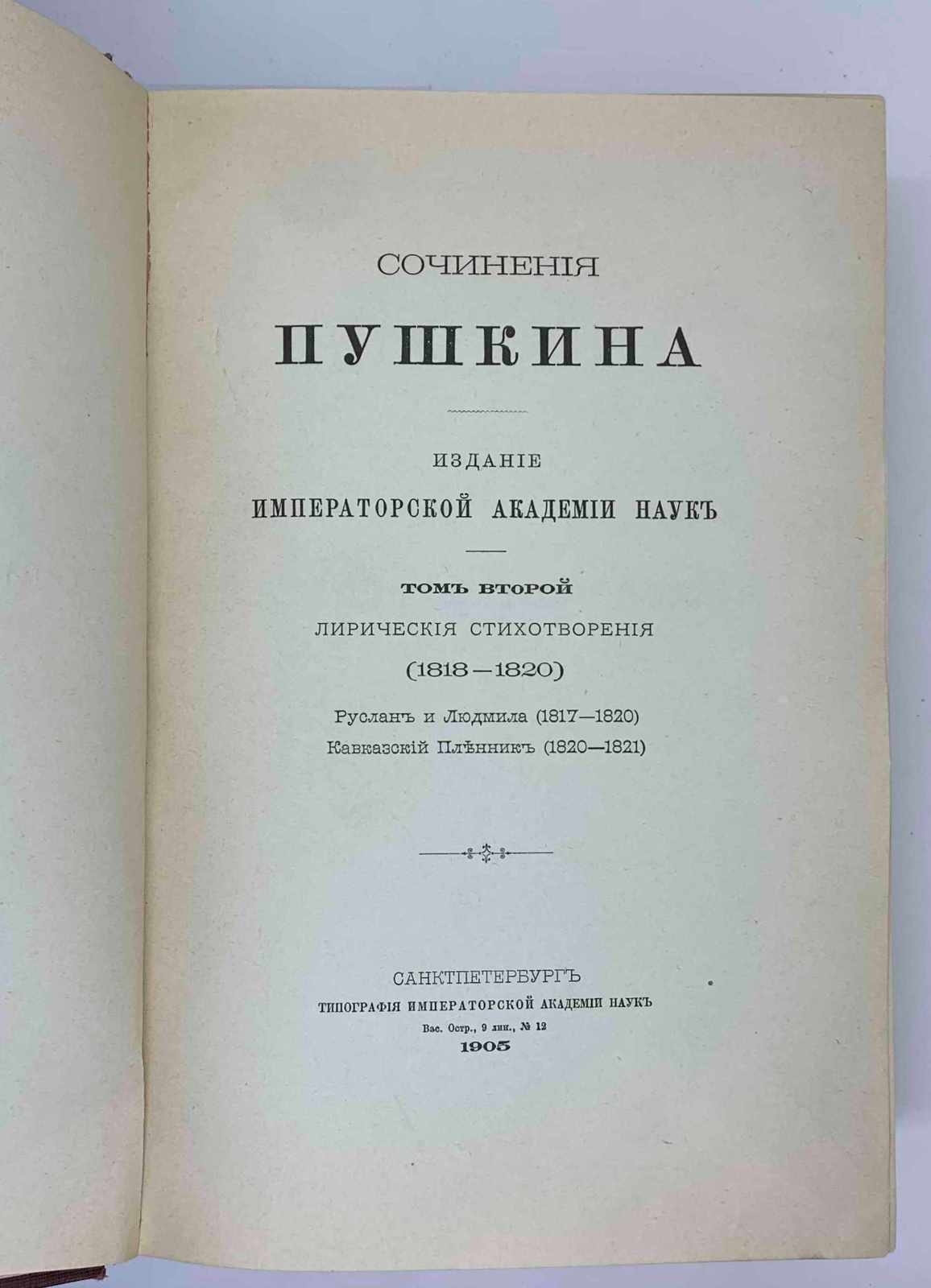 In Russian. Short description: Pushkin A.S. Compositions. Edition (printing house) of the Imperial Academy of Sciences. Volume 1 (1899) Volume 2. Lyric poems. (1905) Volume 3. Lyric poems. (1912) Volume four. Lyric poems. (1916) Volume 11. The history of the Pugachev rebellion. (1914) Collected works of A. S. Pushkin has an interesting history. At the end of the 19th century, on the occasion of the 100th anniversary of the poet's birth, it was decided to publish a complete, critical collection of the author's works. In 1899, the first volume was published (under the editorship of L. N. Maykov). However, in 1900, L. N. Maikov died, and the whole Commission of the Academy of Sciences for the publication of Pushkin's works continued to be engaged in editorial activities. For a long time the commission could not come to an agreement on the principle by which to compose a multi-volume edition. For this reason, the second volume was published only in 1905. The third and fourth volumes (1912, 1916) were also prepared with great difficulty. On the fourth volume (Poems and Dramaturgy 1825-1827), work on the sequential edition of A. S. Pushkin's poetic works was interrupted. In 1914, the eleventh volume of the Academic Edition (History of the Pugachev rebellion) was published. Volumes V, VI, VII, VIII, X, XII were never published. Thus, these are all volumes published up to and including 1914. Please feel free to contact us for a detailed description of the copies available. SKUMS000495 kn_nat
