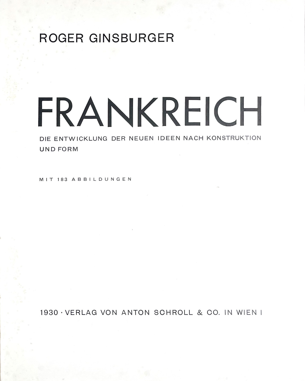 In German. Short description: Roger Ginzburger, El Lissitzky (Art cover artist). Frankreich. Neues Bauen in der Welt 3. Anton Schroll Co, Wien, 1930. Quarto. 132pp. Original photographic dust-jacket over stiff wrappers. Remarkable architectural work on the development of new ideas of construction and form. This striking photographic survey of French architecture by Roger Ginsburger, features bridges, industrial buildings and factories, monuments such as the Eiffel Tower, churches, pavilions, and other 1920s buildings by Auguste Perret, Tony Garnier, Henri Sauvage, Le Corbusier, Andre Lurcat, Gabriel Guevrekian, and others. This volume, the third of the Neues Bauen in der Welt series, is profusely illustrated with numerous b/w photographic reproductions and floor plans. The stunning photograph featured on the dust-jacket is by El Lissitzky. Please feel free to contact us for a detailed description of the copies available. SKUMS000900 kn_nat