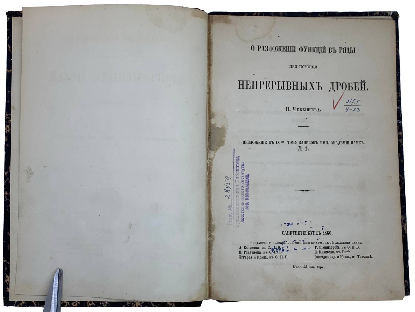 In Russian. Short description: Chebyshev P. On the expansion of functions into series using continued fractions. [O razlozhenii funkcij v ryady pri pomoshchi nepreryvnyh drobej]. St. Petersburg, Printing House of the Imperial Academy of Sciences, 1866. 26p. Semi-leather binding. Enlarged format. This work laid the foundation for the development of continued fraction theory and its application in approximation theory. The book was well-received by mathematicians of the time and has been influential in the development of mathematics and its applications in science and engineering. Please feel free to contact us for a detailed description of the copies available. SKUMS002187 kn_nat