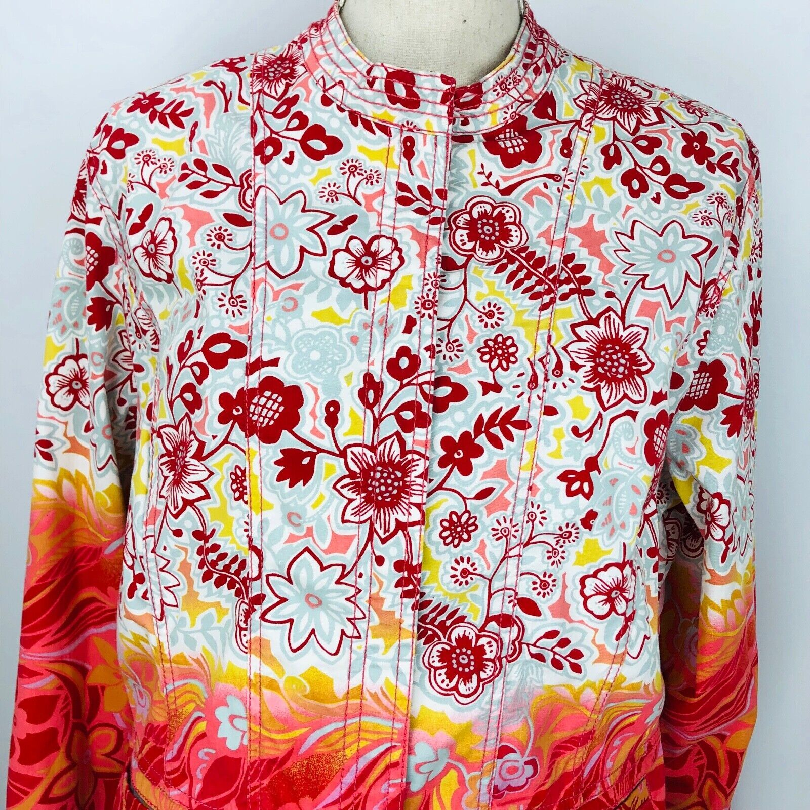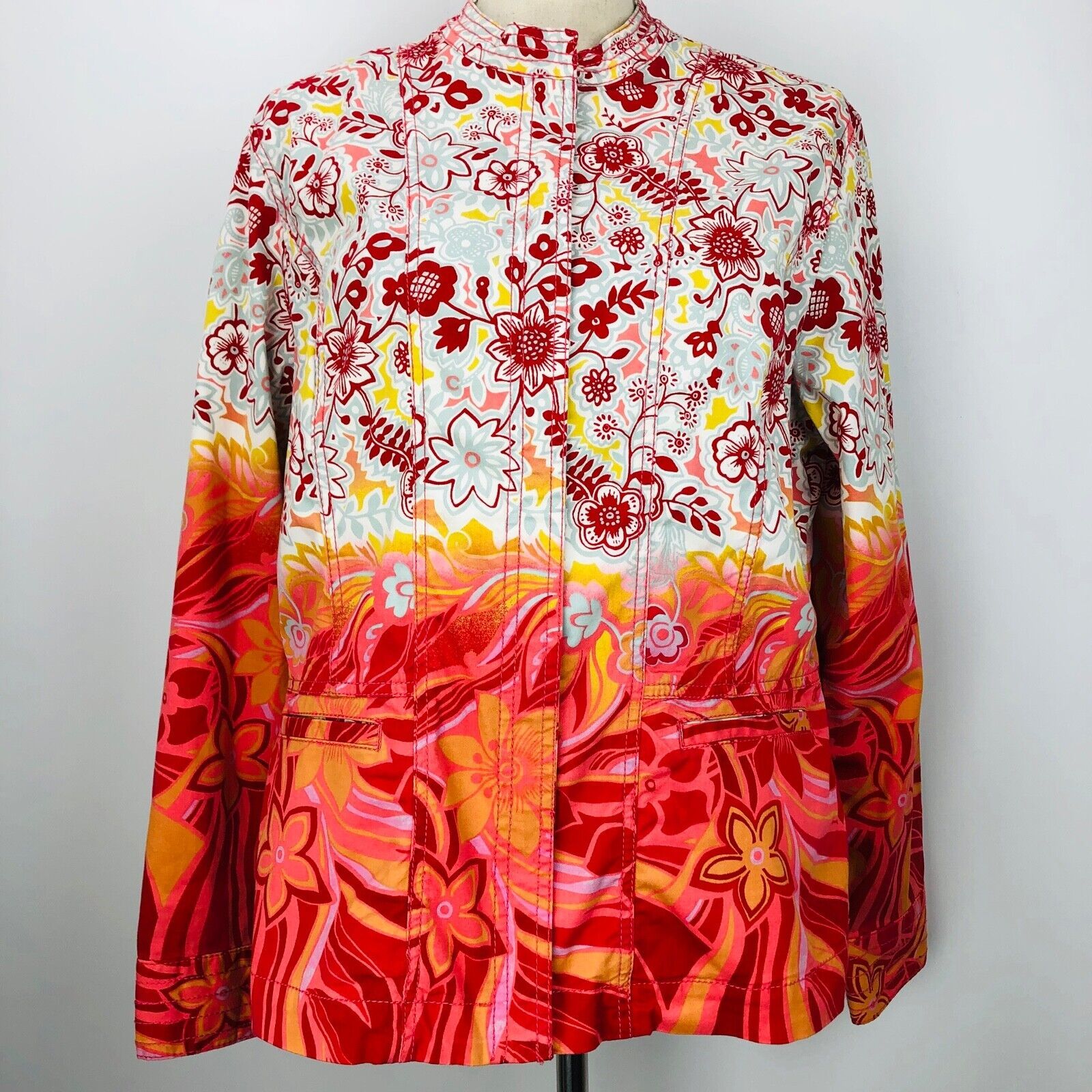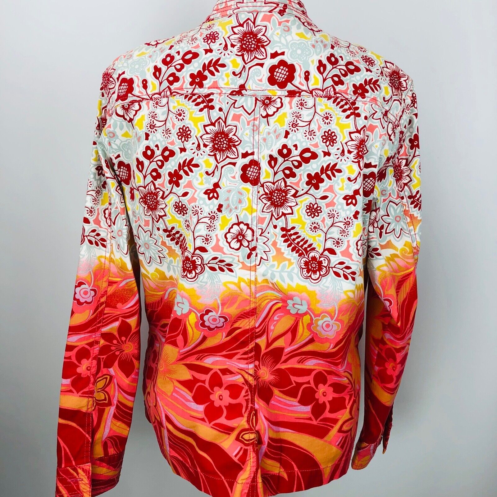 Chico's Women's Jacket Size 2 Large Orange Red Floral Zip Ombre Stretch