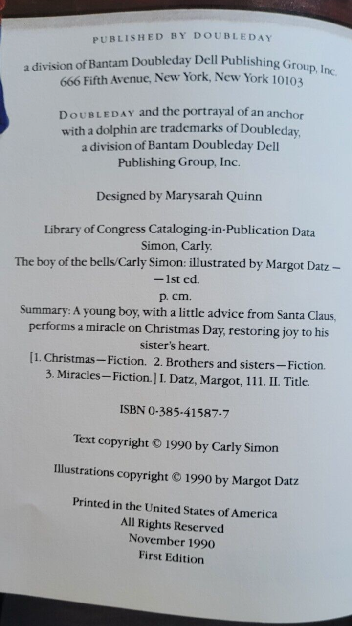 Hardback Book The Boy of the Bells Carly Simon Family Christmas Holidays Nice