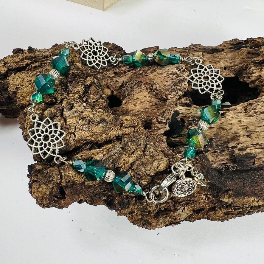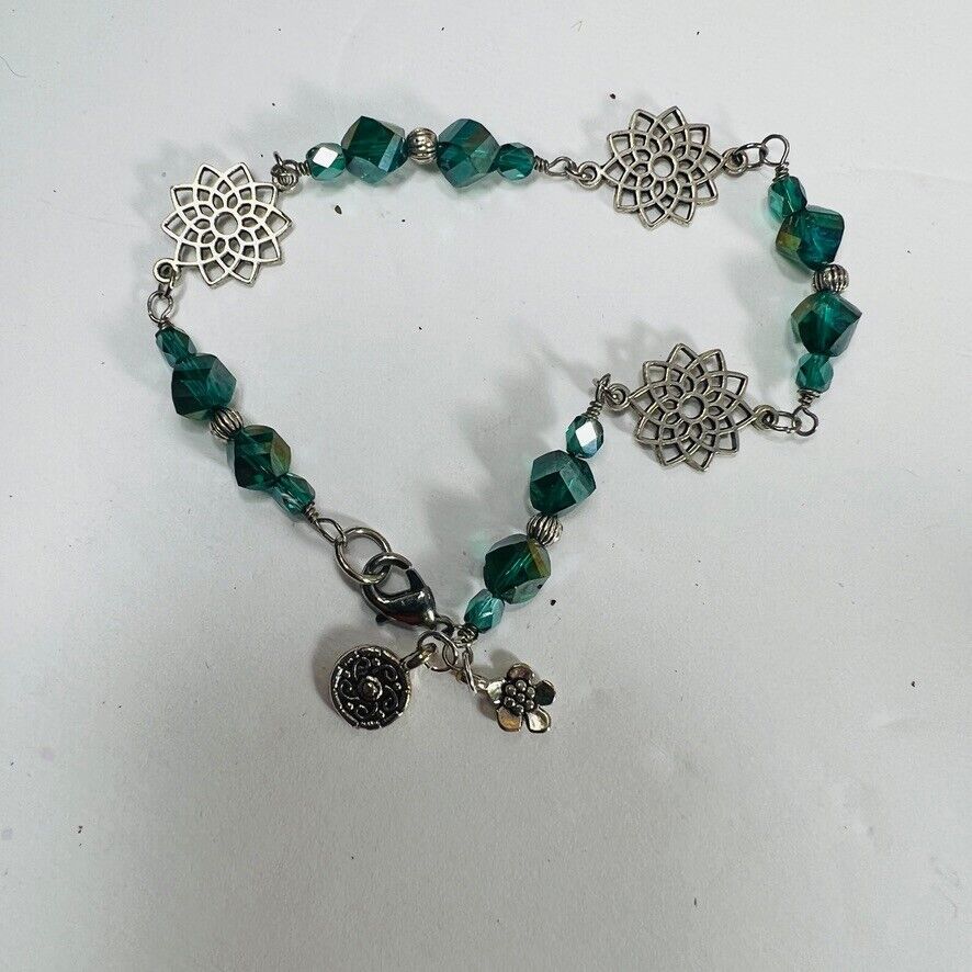 Swarovski Crystal Bead Aqua Bracelet Flower Charm Silver Tone Large Handmade