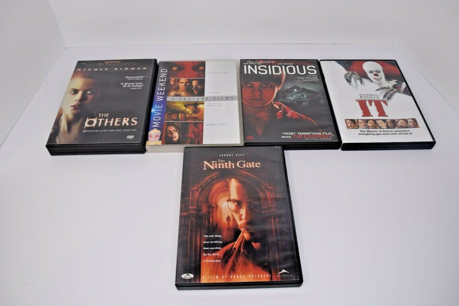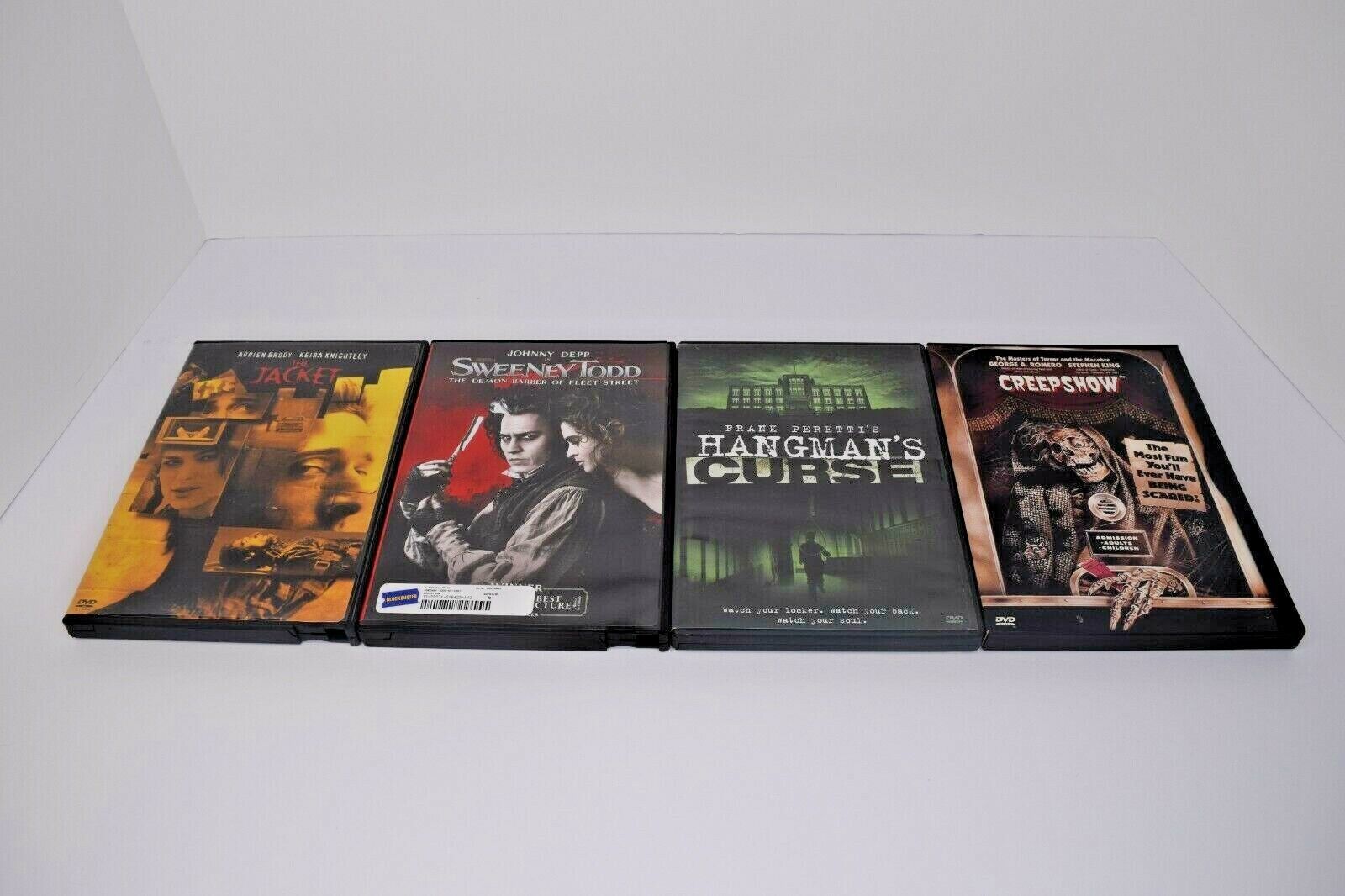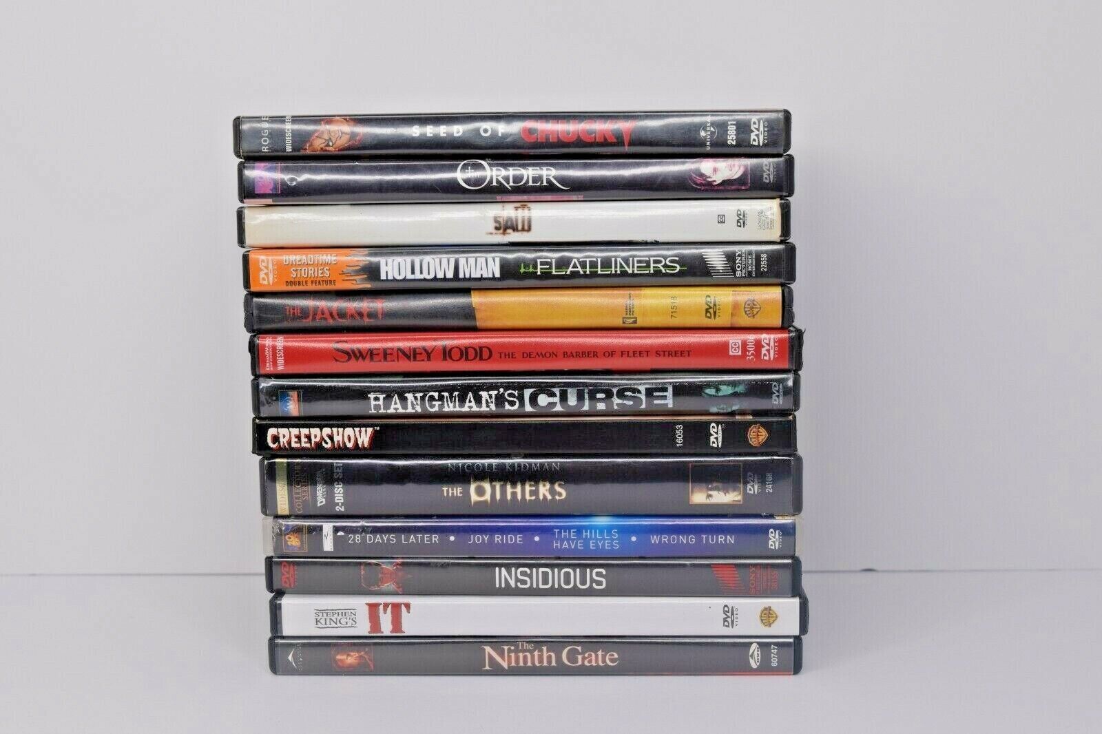 Lot of 13 Horror DVDs. All are pre-owned in Good Condition. There are different levels of wear to the DVDs, but all have been tested to the menu screen. Some cases are nice, others have more wear, but no major damage to any cases. Movies are: The Others, Insidious, The Ninth Gate, It (Mini-Series), The Jacket, Sweeney Todd, Hangman's Curse, Creepshow, Seed of Chucky, Saw, and one Double Feature: Hollow Man Flatliners, and one 4-pack: 28 Days Later, Joy Ride, The Hills Have Eyes, and Wrong Turn. See all photos for details and condition. Will ship USPS Media Mail.