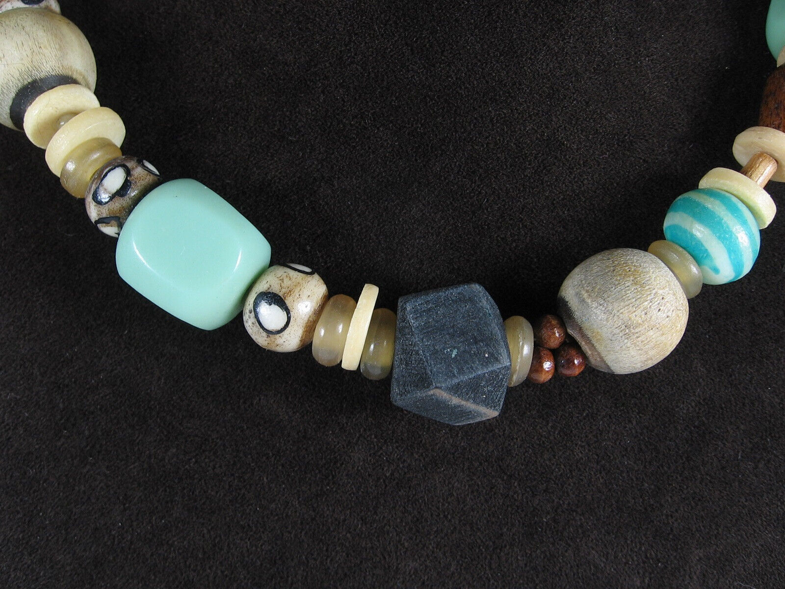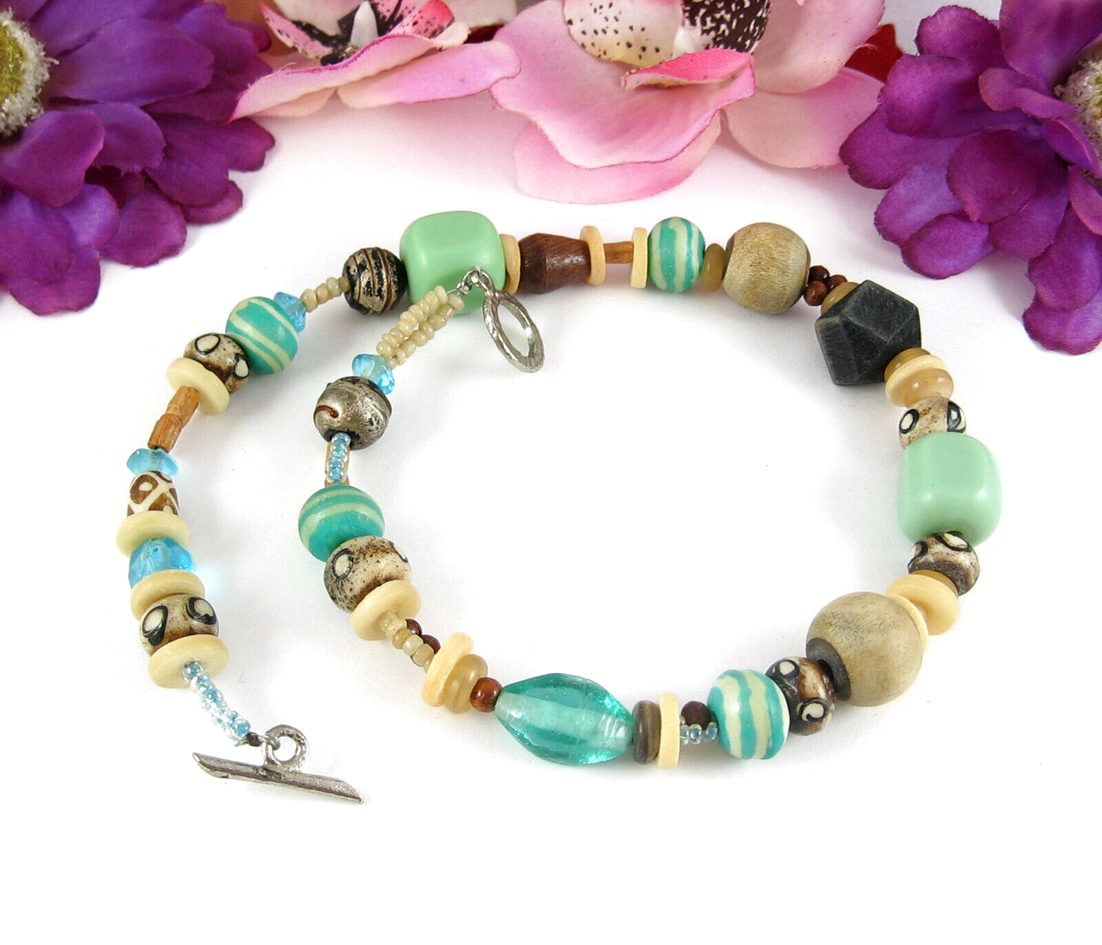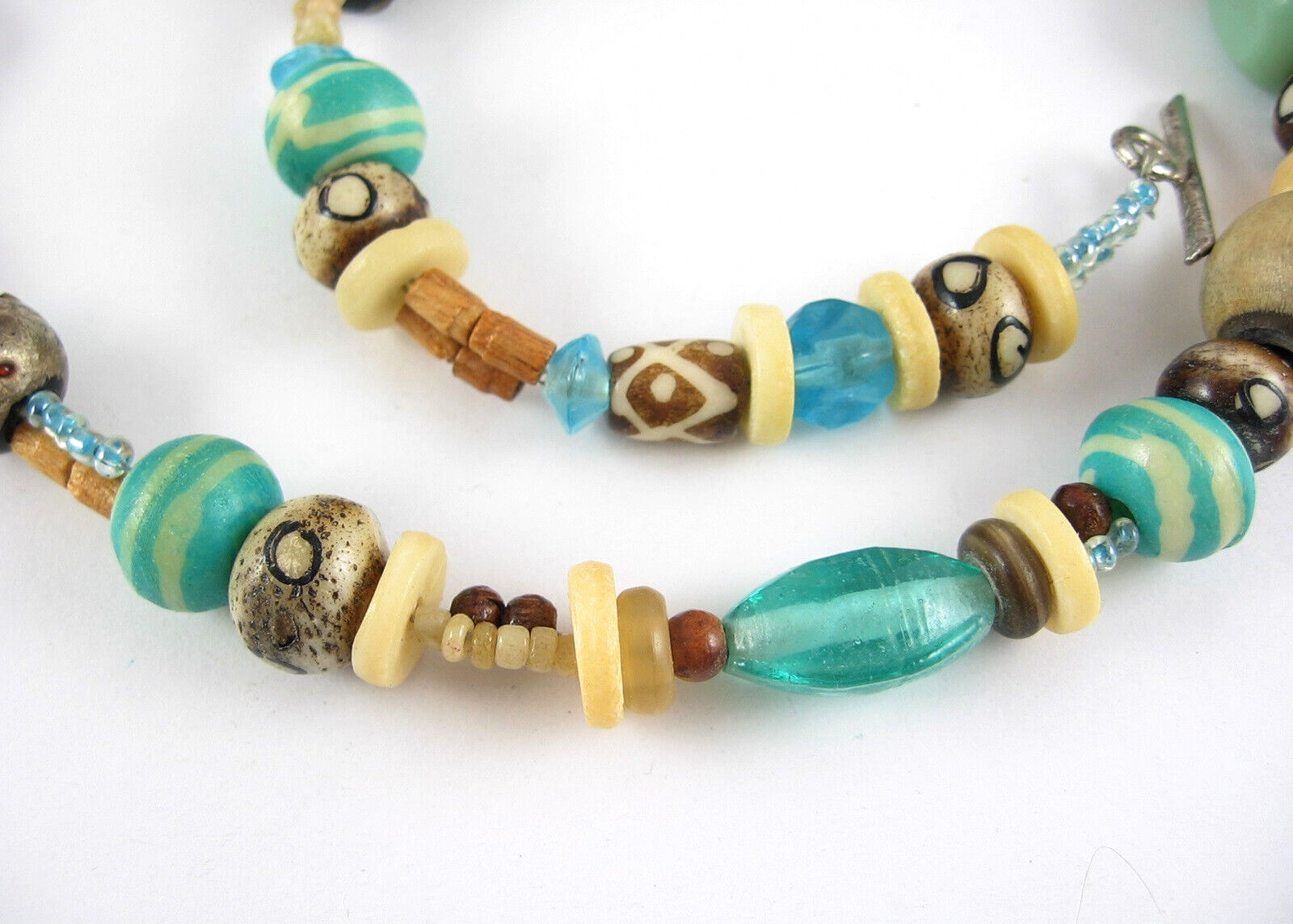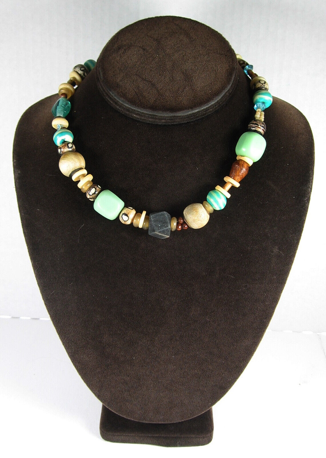 SEA FOAM GREEN & SAND BEADS Vintage Necklace Beaded Wood Art Glass Blue 15.5"