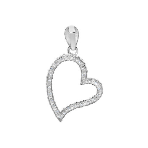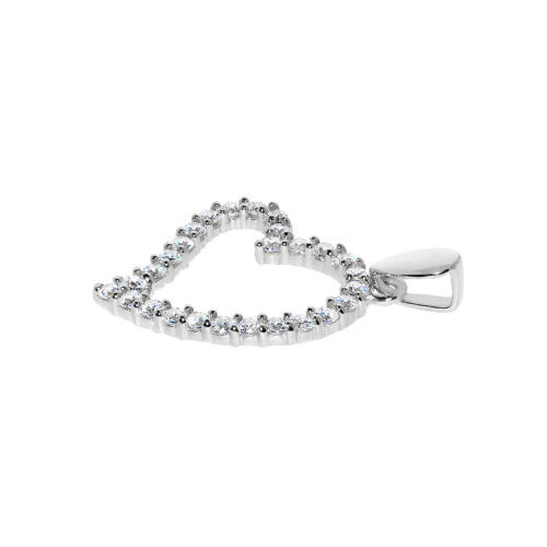 This stunning heart pendant captures the essence of modern elegance with its captivating curved design. Crafted from 14-karat white gold, the pendant showcases an open silhouette adorned with a shimmering array of round-cut cubic zirconia, glistening with every movement. Measuring 13/16" in length and 9/16" in width, this delicate piece is both lightweight and sophisticated, tipping the scales at just approximately 1 gram. It comes beautifully paired with a matching 14k white gold chain, designed in a classic rolo style, available in your choice of lengths ranging from 16 to 24 inches.