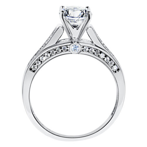 This exquisitely crafted ring, made from 14k white gold, features a fiery round-cut Diamonette Cubic Zirconia center stone, radiating brilliance and elegance. Surrounding the main stone are lovely round-cut Diamonette Cubic Zirconia side stones that grace the front and top of the band, enhancing the overall sparkle. The total Diamonette Cubic Zirconia carat weight is equivalent to 1.50 carats of natural diamonds.