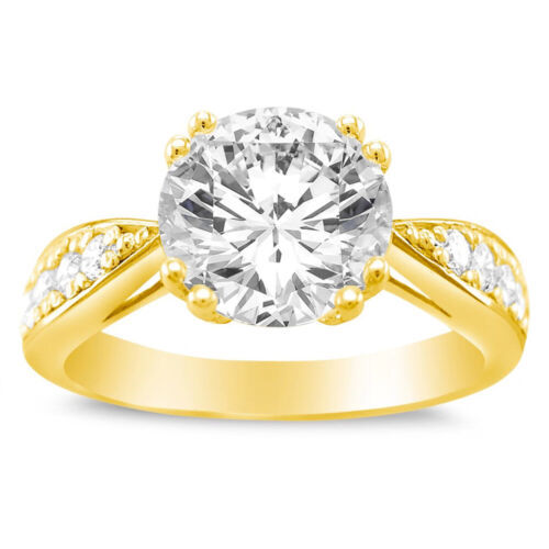 This expertly crafted ring is constructed of 14k-yellow gold and features a fiery round-cut Diamonette - Diamond Simulant center stone. Each side of the tapered band features pave-set, round-cut side stones. The Diamonette carat weight is equivalent to a 1.1 carats of natural diamonds.