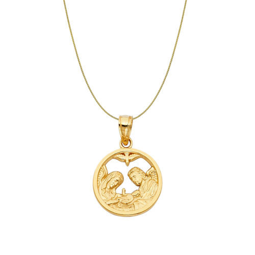 This exquisite Baptismal pendant is crafted from genuine 14-karat yellow gold and features a detailed round design showcasing angels and a dove witnessing an infant's baptism. Measuring 0.59 inches in length, this pendant embodies a beautiful expression of faith. Accompanying the pendant is a matching 14k yellow gold wheat chain, available in lengths of 16, 18, 20, or 22 inches, providing versatility for both men and women.