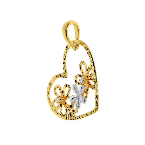 Delicate and enchanting, this heart-shaped pendant captures the essence of love with its dazzling diamond-cut design that radiates a captivating sparkle. At the center of the heart, a beautiful trio of flowers is crafted in yellow and white gold, adorned with shimmering round-cut cubic zirconia that adds to its charm. Made from 14-karat gold, the pendant measures 9/16" in length and 13/16" in width, making it a perfect adornment for any occasion.