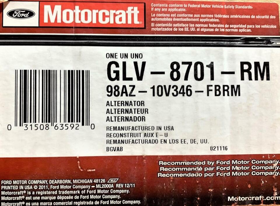 GLV-8701-RM Motorcraft 12V 105 AMP ALTERNATOR for 2000-2004 Ford Focus 2.0L