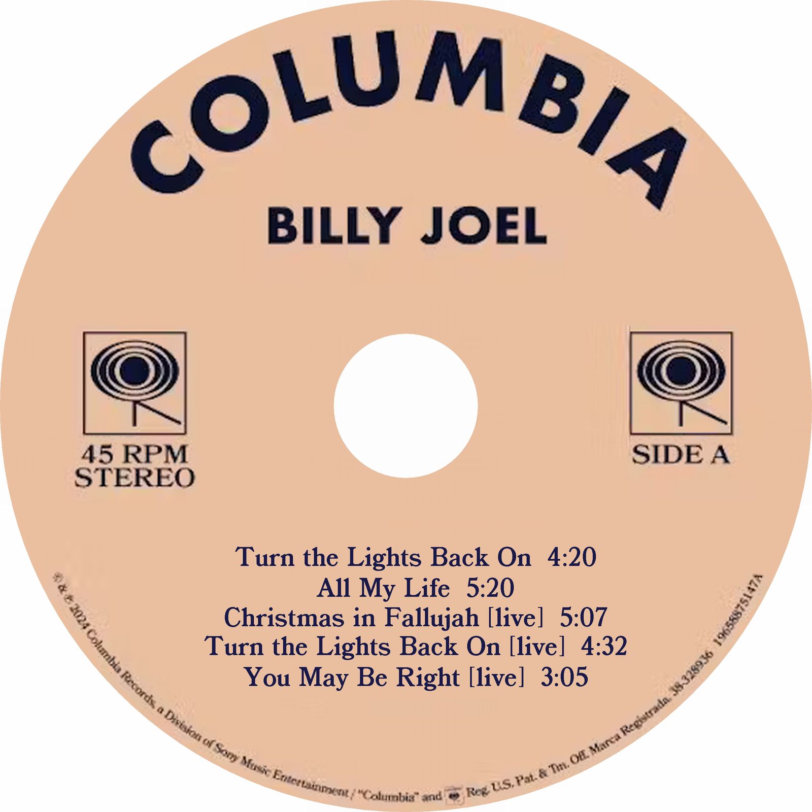 Billy's first new single in decades is a true return to form and it's now available as a beautiful (fan-made) disc, which includes Billy's other two new songs from this century (All My Life and the live performance of Christmas In Fallujah which was released only in Australia) and adds Billy's recent Grammy performances of both the new song along with You May Be Right to round out the disc in fine fashion. Sound quality is top-notch throughout and as a bonus, the version of Turn The Lights Back On included here is the longer version from the vinyl 45 and not the digital download version, which chops off the intro. This disc has everything you need to keep your Billy Joel collection up to date. Perfect for that Billy fan in your life.