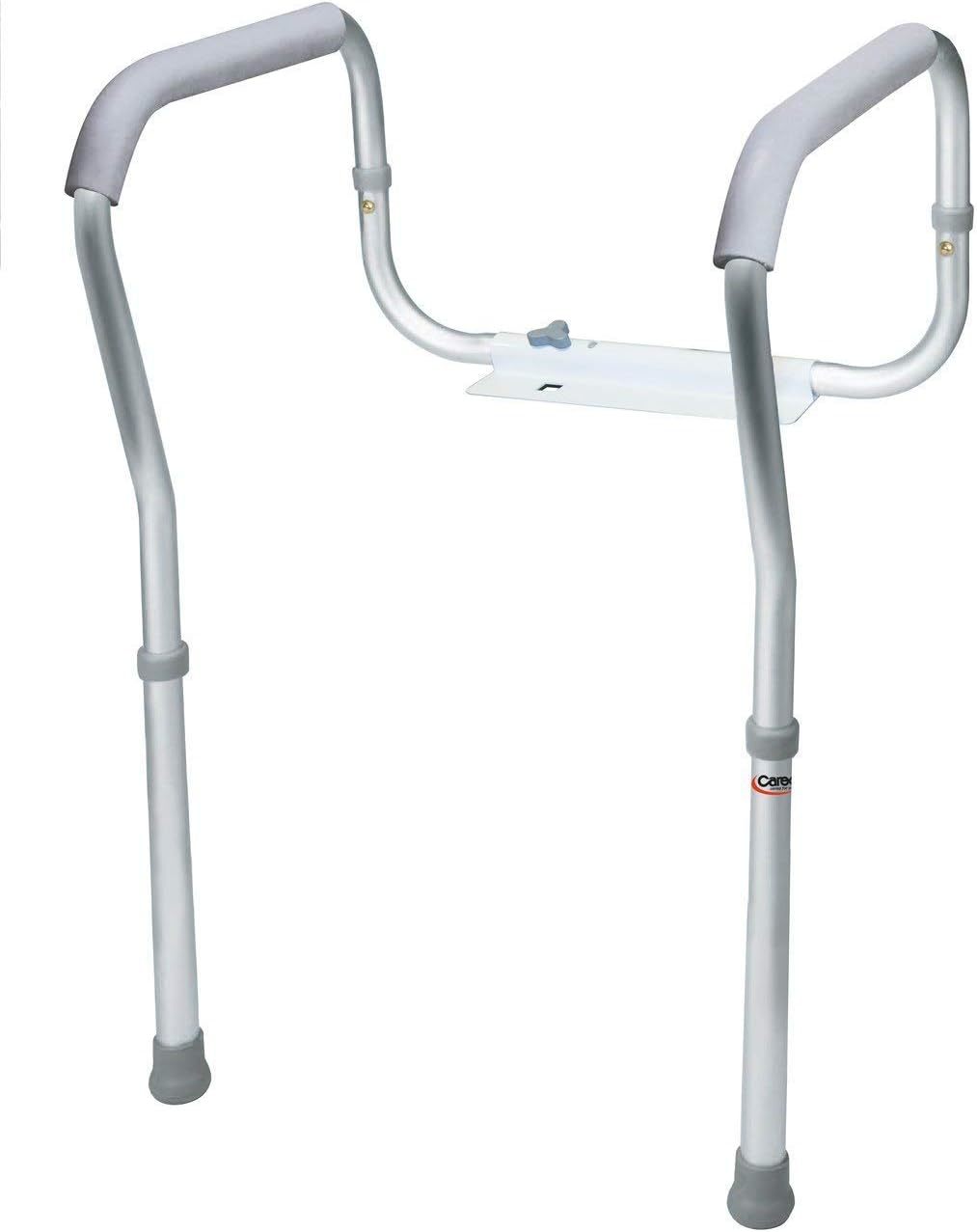 Handicap grab bars that allow you to sit safely or stand at the toilet. Perfect for those who are a fall risk and need handles at the bathroom or those who have a handicap toilet. Non-slip rubber tips keep the bathroom grab bars firmly in place and provide for bathroom safety for those afraid of falling or have trouble standing. The toilet stand is easy to install and setup. The toilet rail would pair up nice with a handicap toilet seat for added bathroom safety. Handle width is adjustable from 18 - 20" and would be perfect toilet handles for elderly or seniors who may need adjustable heights. includes padded handles and an aluminum frame. Would also work with a commode toilet chair. Trust in Carex, a leader in bathroom safety bars and toilet bars for elderly, handicap, senior, and the disable.