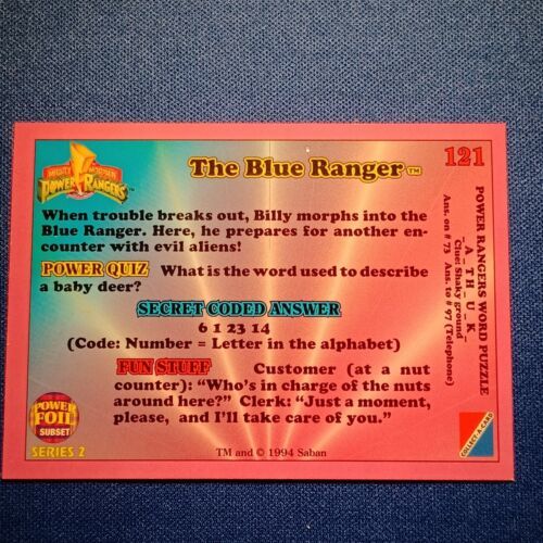 This is a vintage non-sport trading card featuring the Blue Ranger from the Mighty Morphin Power Rangers Series Two. Manufactured in 1994 by Power Rangers, the card is made of card stock and is in excellent condition. It is a standard-sized card with a card number of 121 and is part of the Power Ranger franchise. The card is in English and features Billy, the Blue Ranger, from the popular TV show.
