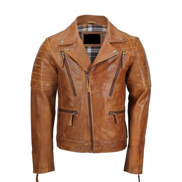 New Men's Custom Made Tan Brown Leather Zipper Style Real Cowhide Leather Biker
