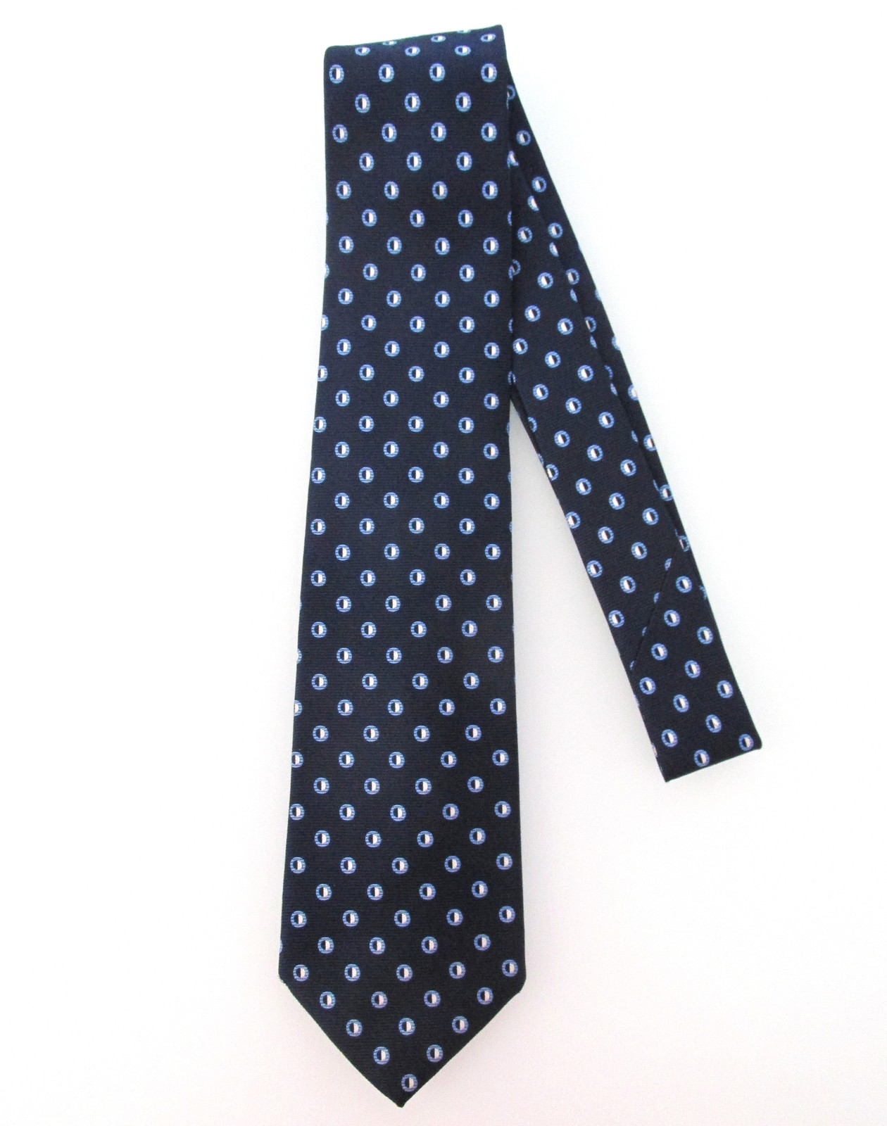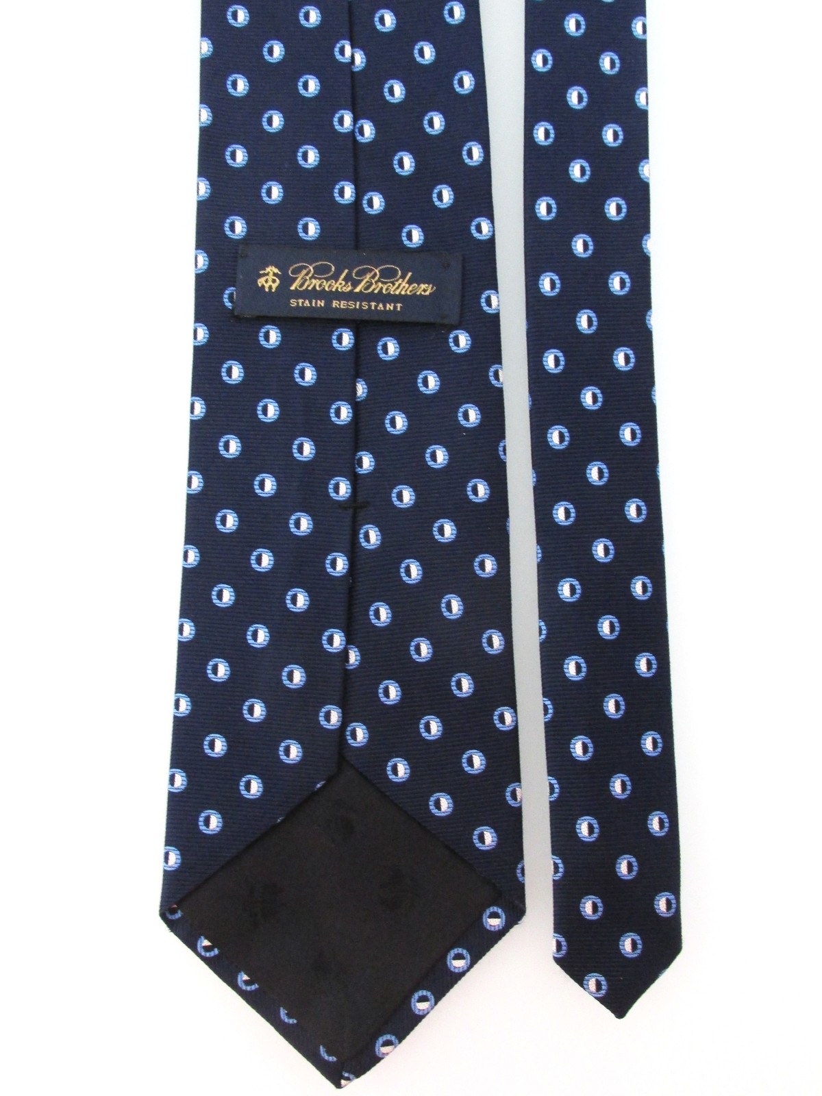 Description: Up for sale is a Brooks Brothers men's silk tie. The tie is handmade in the USA of 100% English silk. The tie has a light blue and white small oval pattern on a navy blue background. Dimensions are approximately 59" long x 3.75" wide. This tie is in excellent condition.