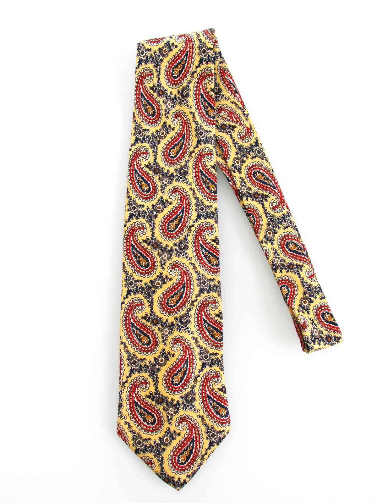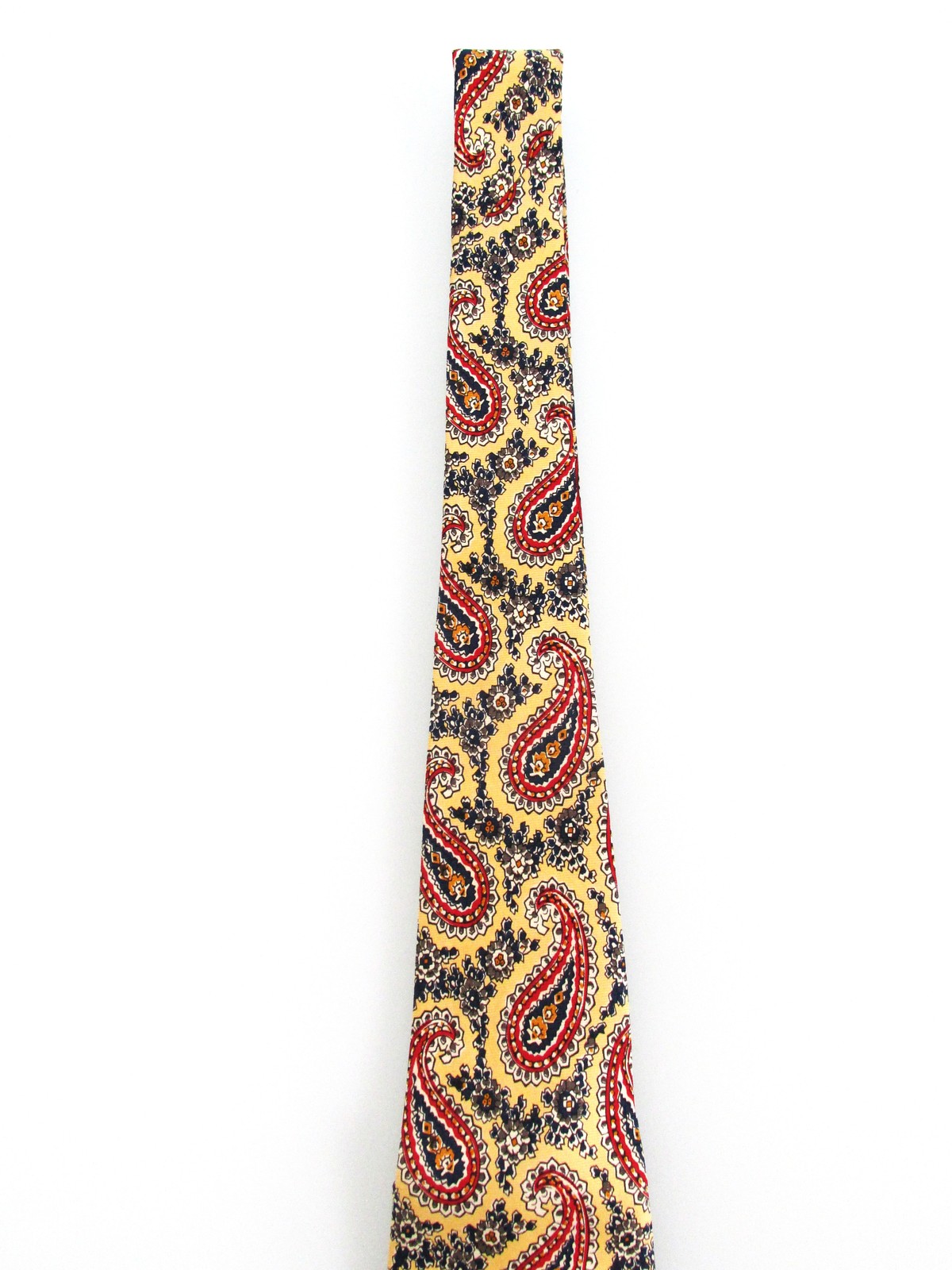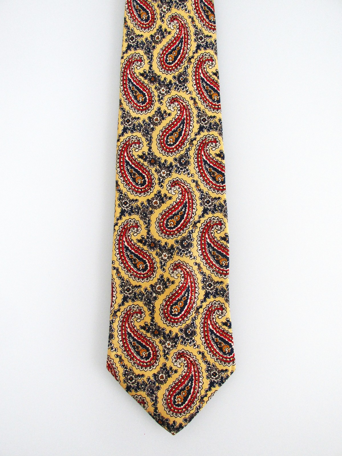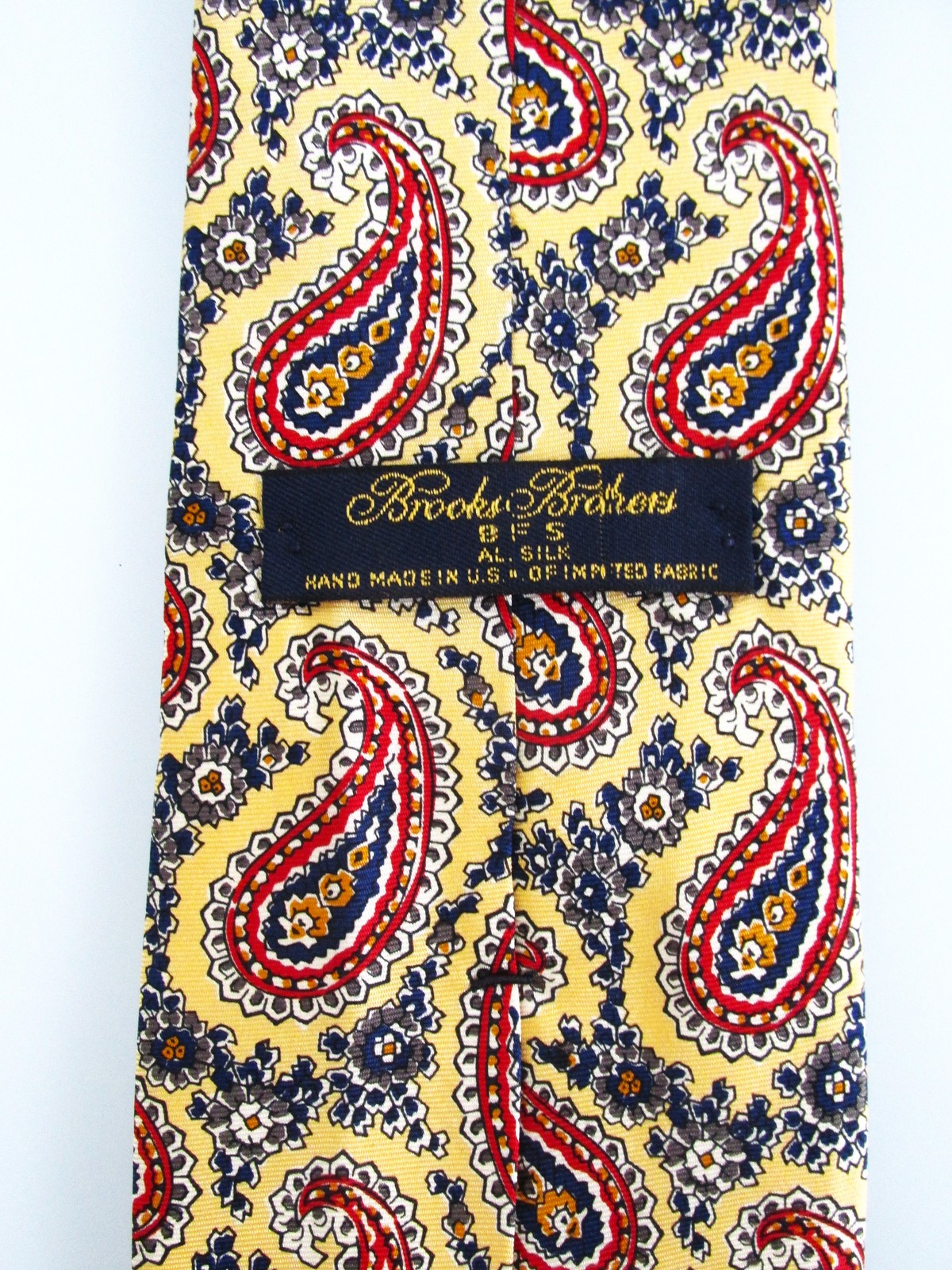 Description: Up for sale is a Brooks Brothers men's silk tie. The tie is handmade in the USA of 100% silk. The tie has a multicolored paisley pattern in blue, red, gray, and white on a yellow background. Dimensions are approximately 56" long x 3.75" wide. This tie is in excellent condition.