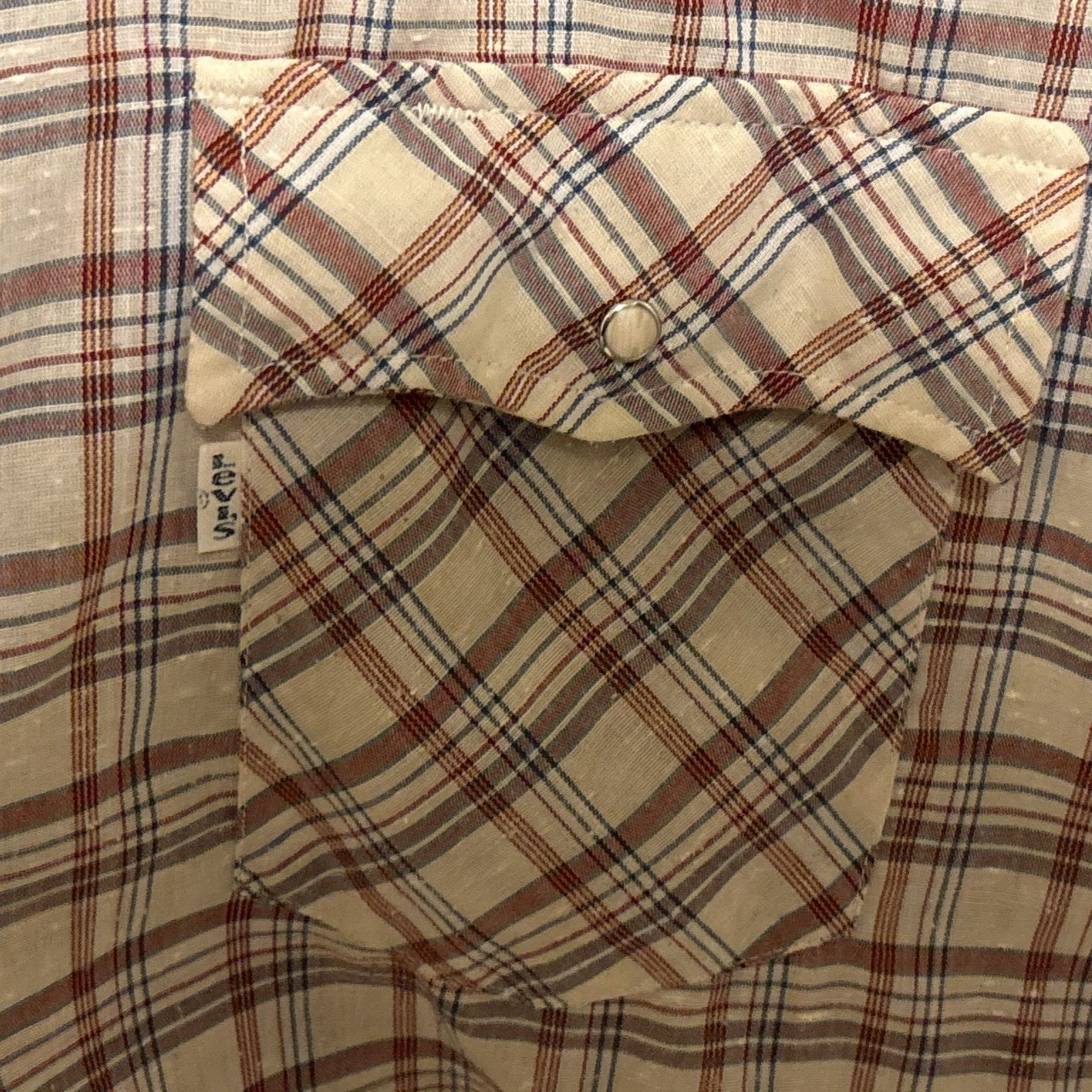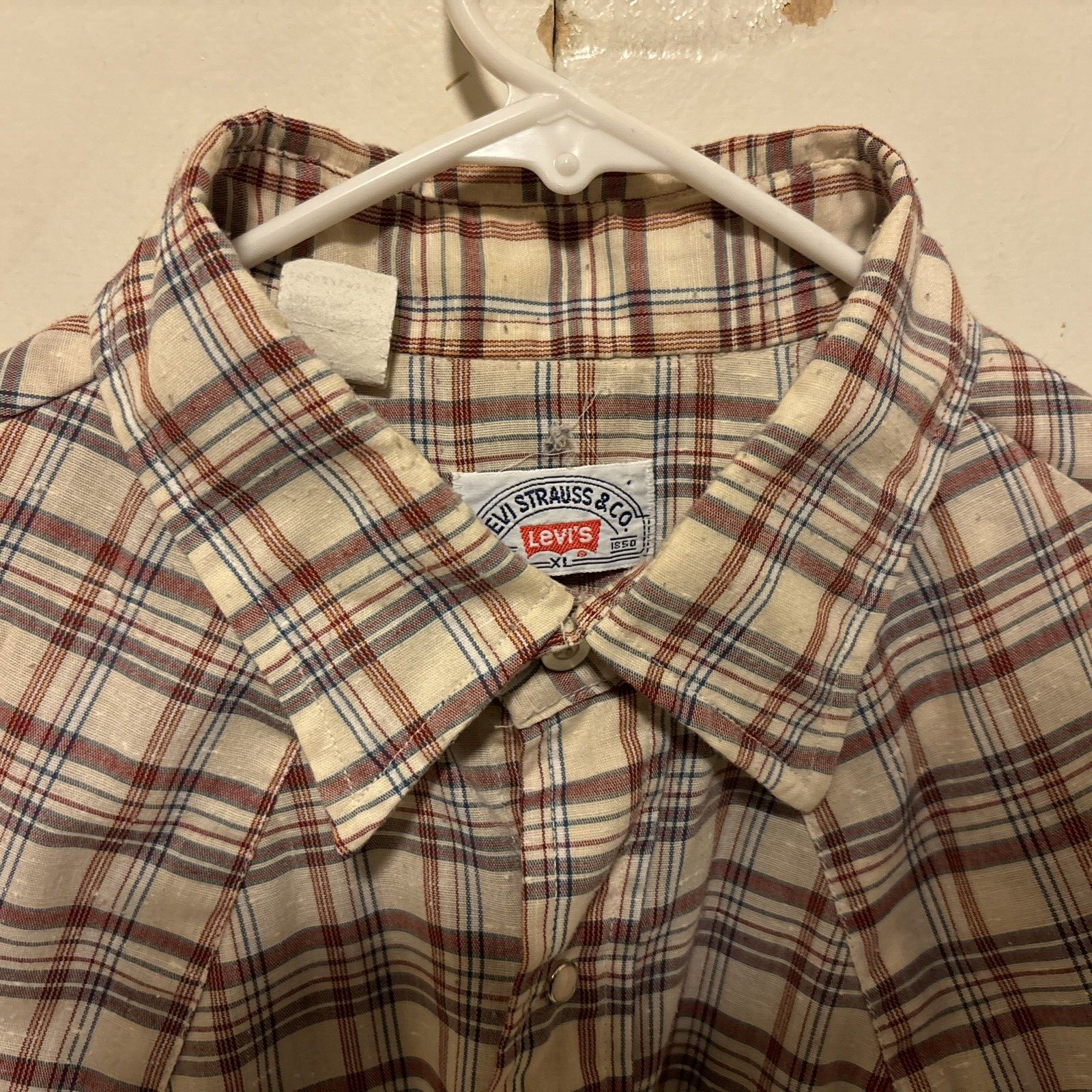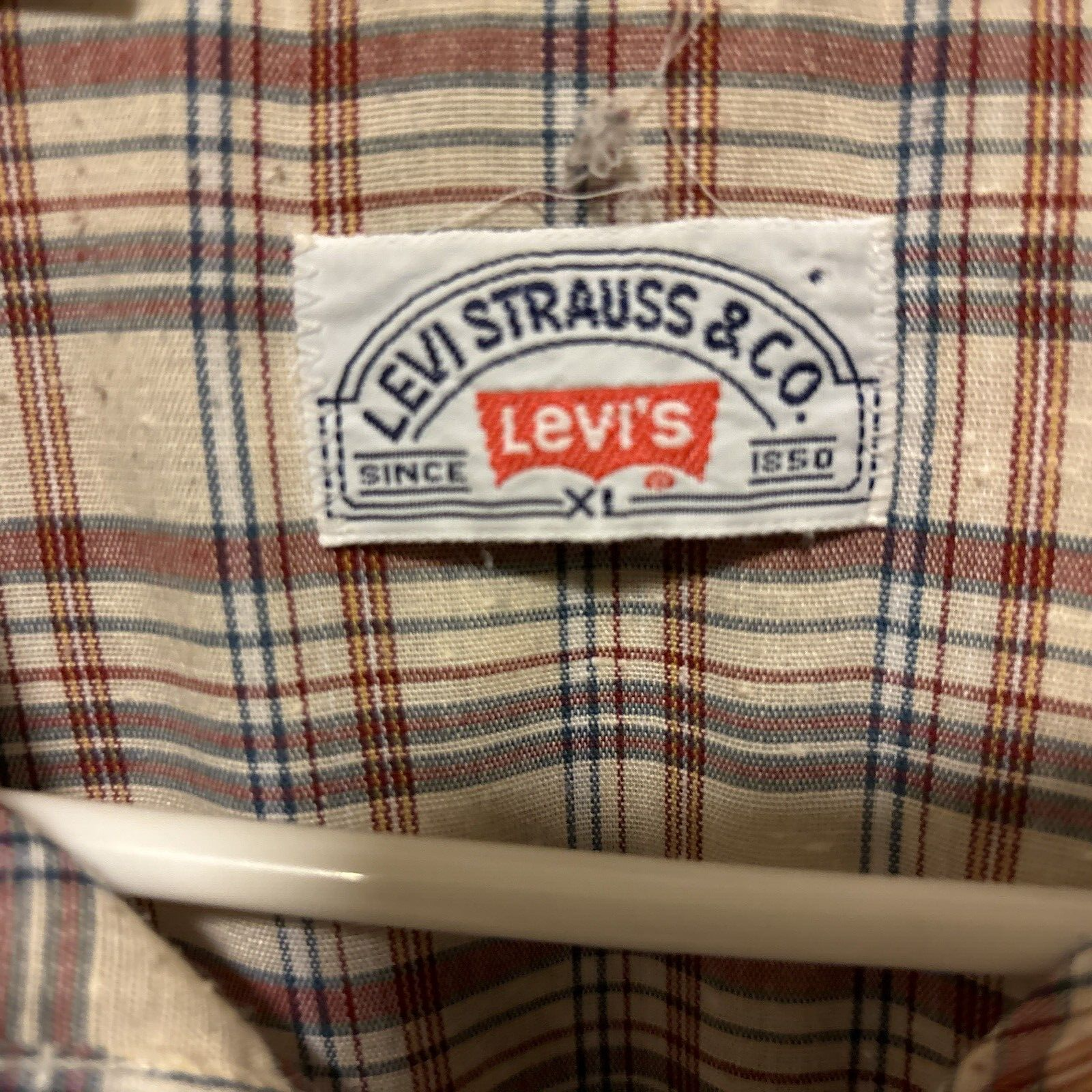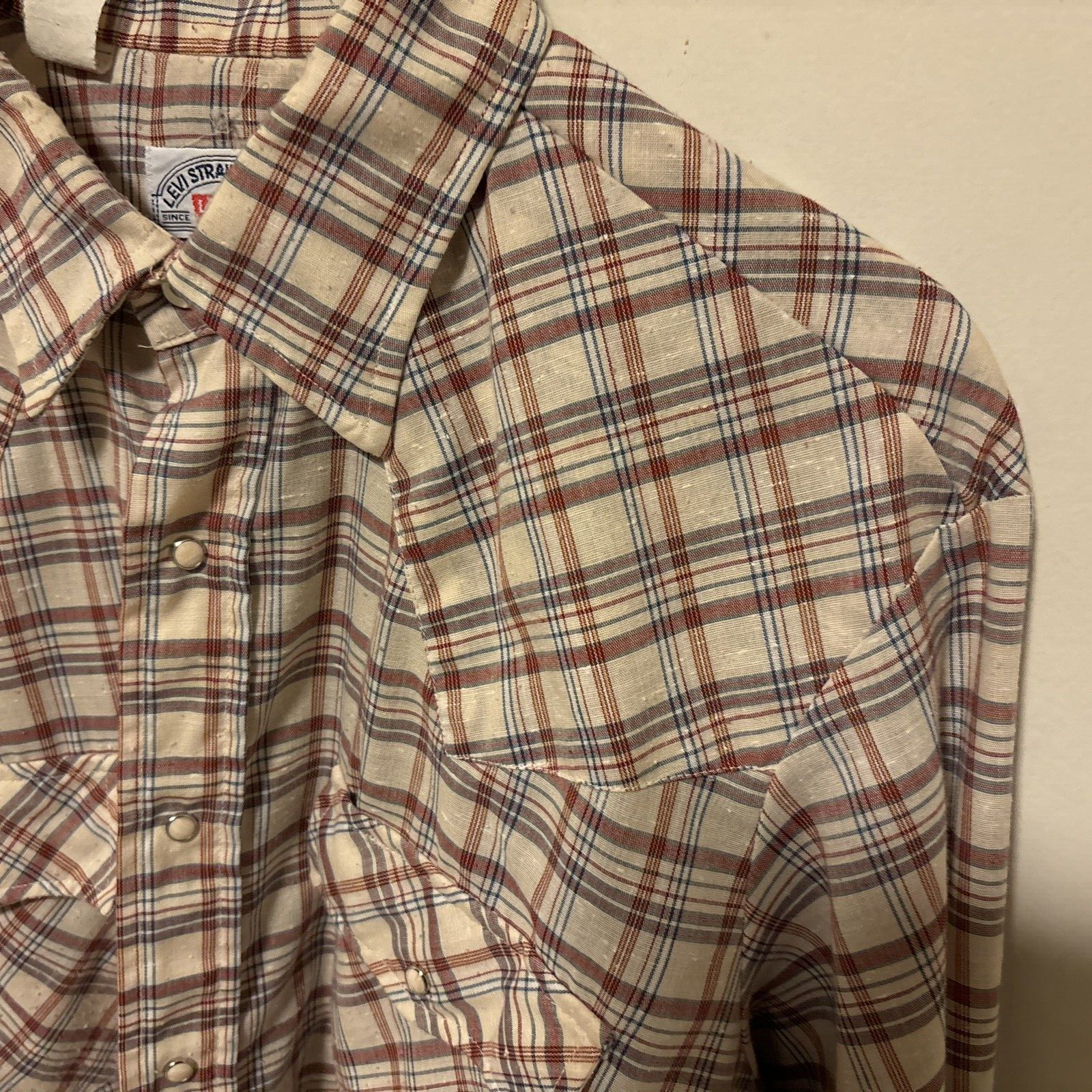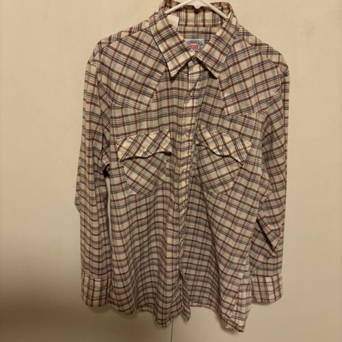 This is a vintage Levi's Western Pearl Snap shirt for men, with a white tab. It is a long-sleeved button-up shirt with a snap closure, and it comes in size XL. The shirt is multicolored and has a solid pattern. The theme of the shirt is Western, which is perfect for those who love the style.