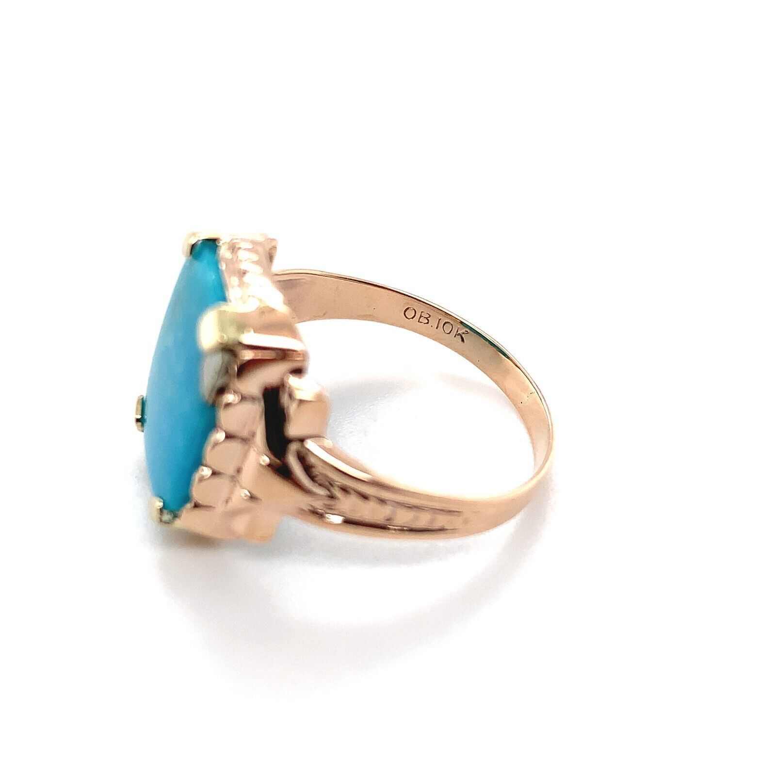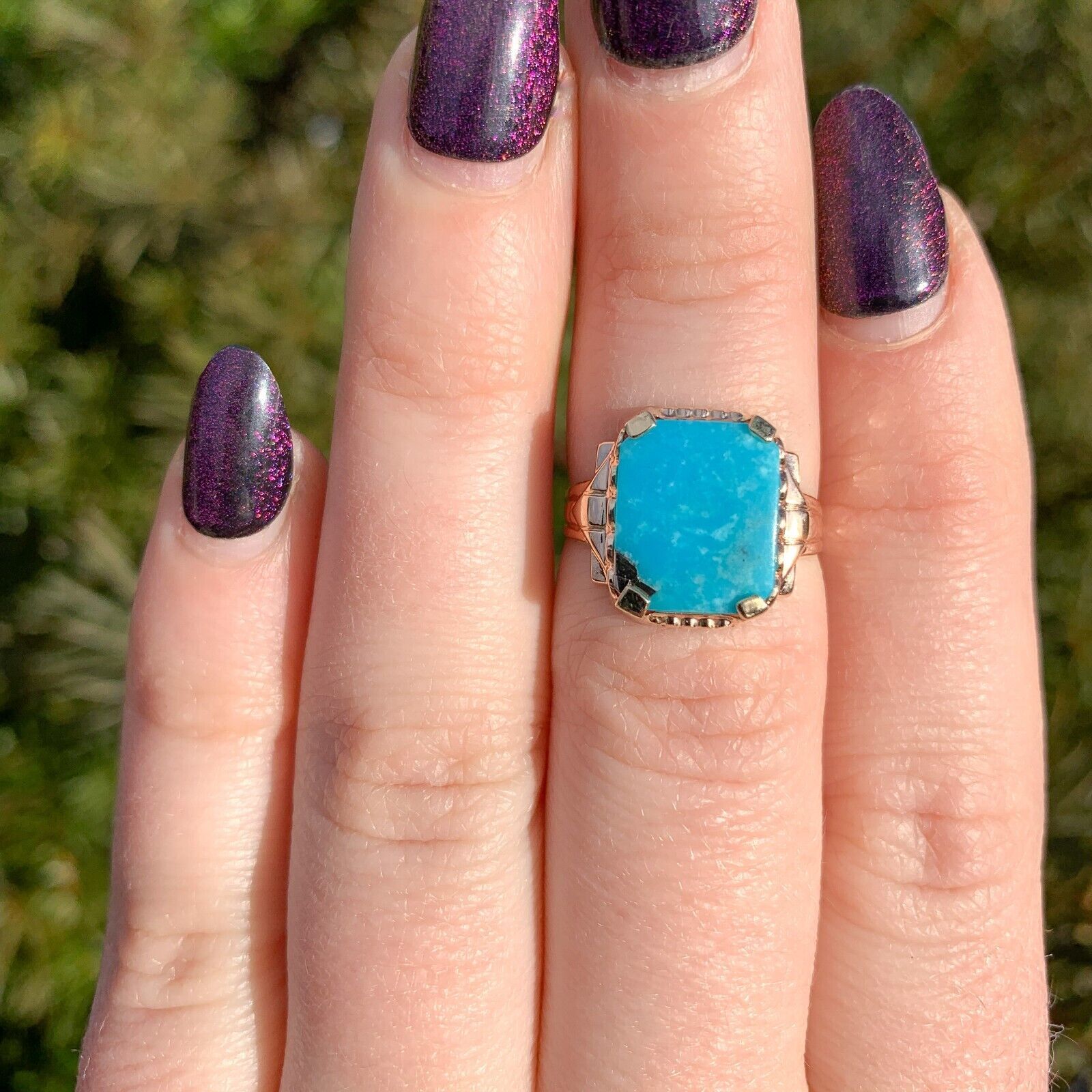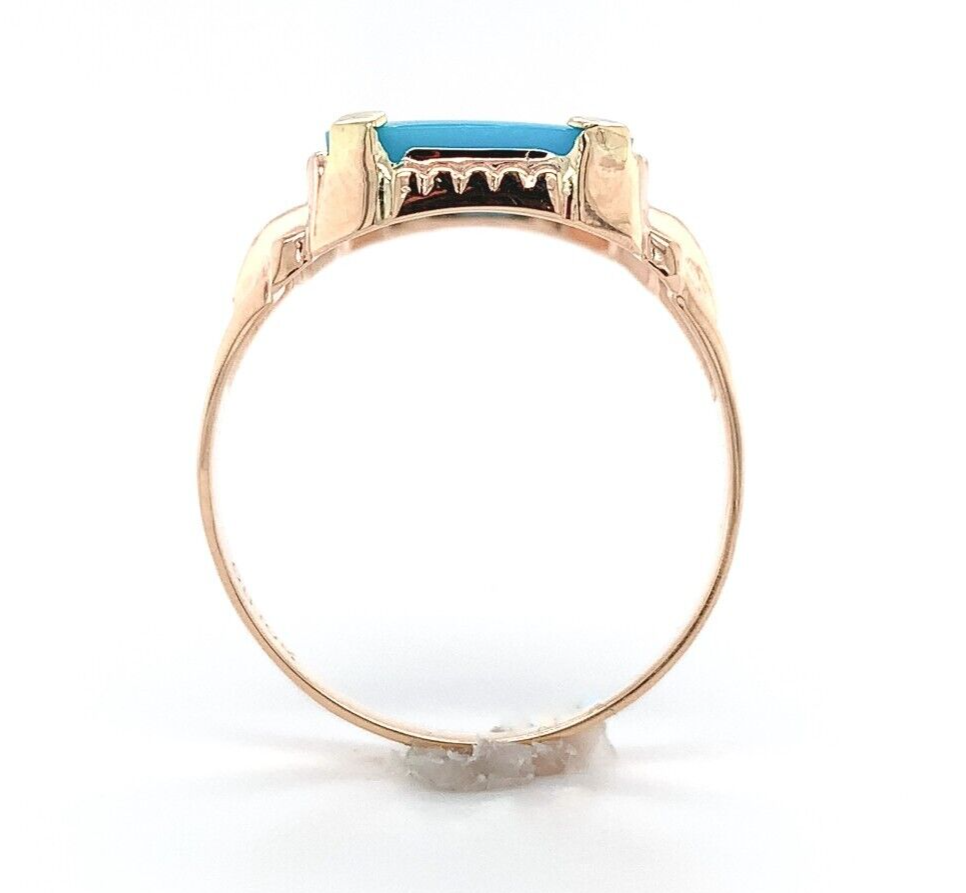 Vintage10k rose gold ring featuring a darker blue rectangular turquoise flat slab weighing 3.36 carats and measuring about 11.5mm x 10mm. The color is more like the photo on the hand. The ring fits a size 6.5 finger, weighs 1.36 dwt., and dates from the 1940s. Wonderful!
