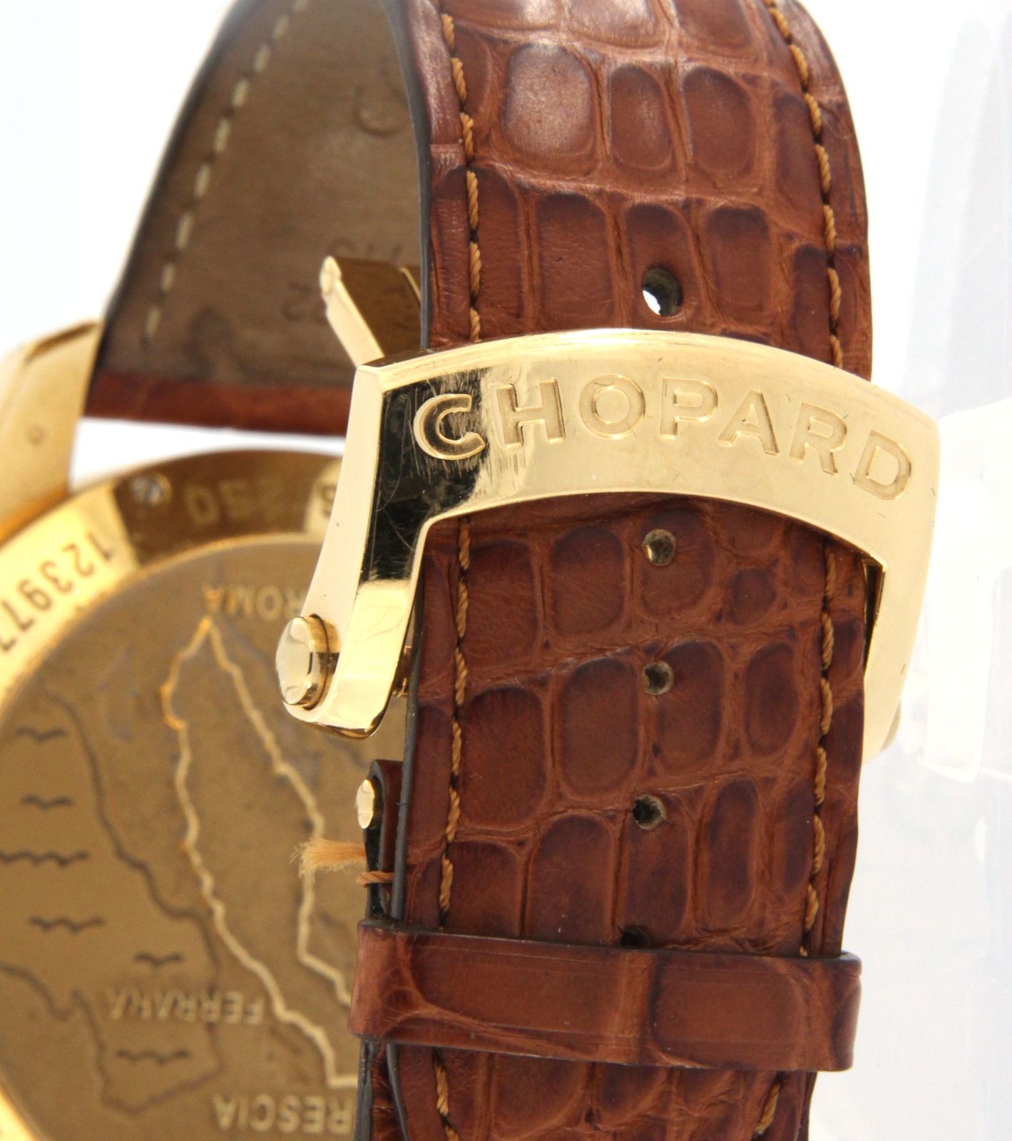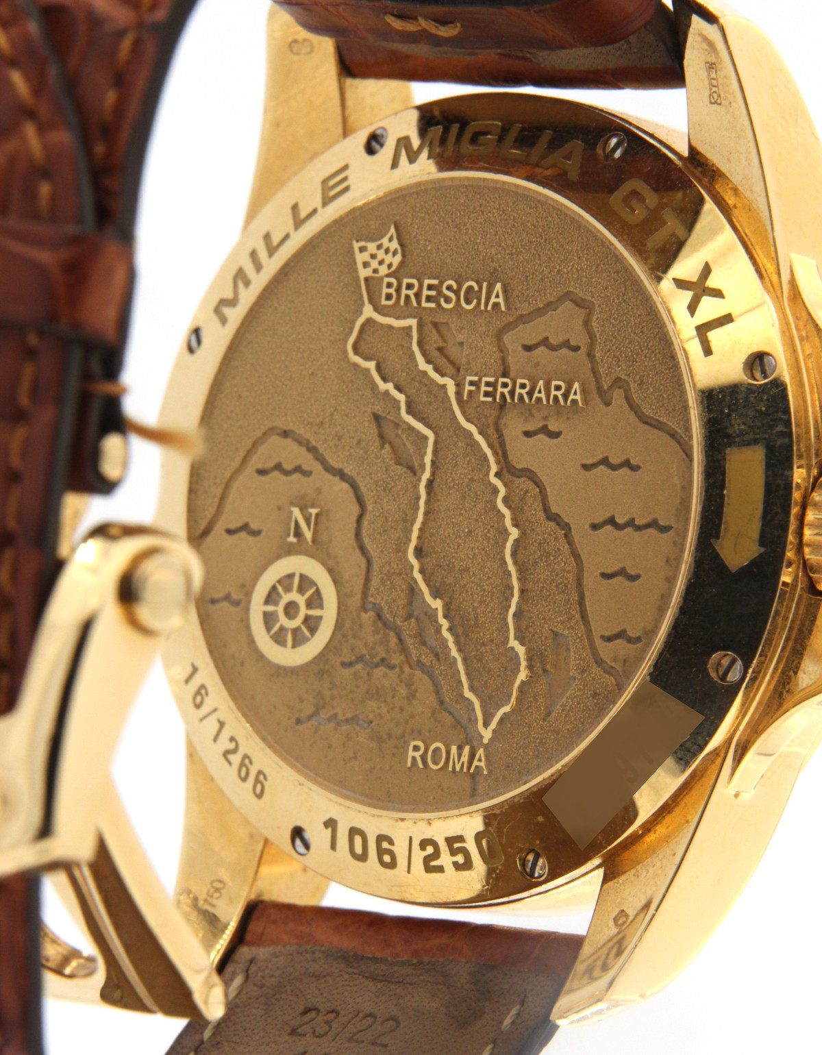 Case width: 44MMModel number: Mille Miglia GT XLType: Wrist watchBrand: ChopardModel name: Limited EditionWeight: 120.3Bracelet length: 8"Movement type: AutomaticCase Material: Gold - YellowBox included: noPaperwork included: noRunning: yesKarat: 18ktDial color: WhiteBand material: LeatherCondition:Used