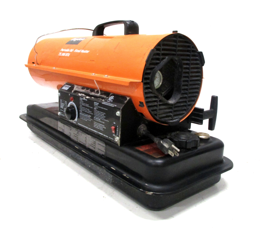 Category: Power equipmentType: HeaterBrand: DaytonModel number: 3VE49GModel name: Oil Fired Torpedo HeaterSize: 75Color: 000BTUPower source: 1830AFF00650Voltage: ElectricNumber of pieces: 110/120VCondition:UsedNotes:Oil Fired Torpedo Heater, 5.0 gal., 0.57 gph, BtuH Output 75,000, 1700 sq. ft.