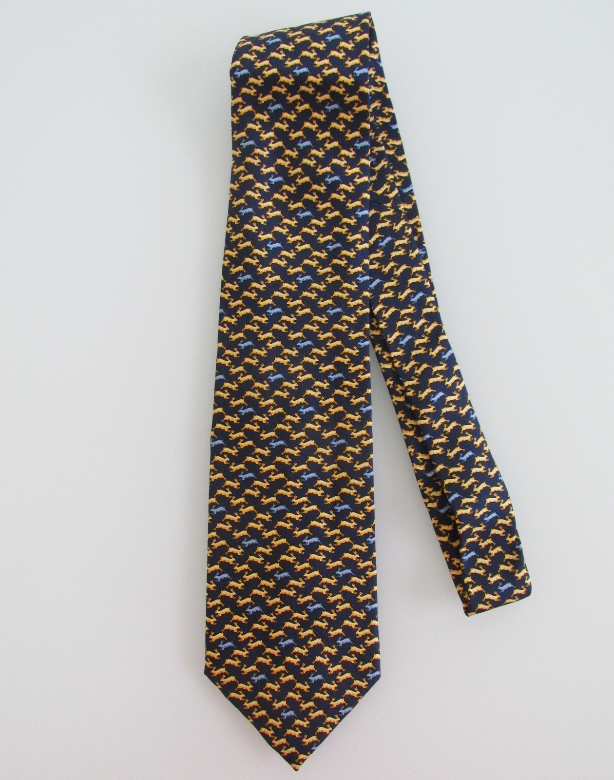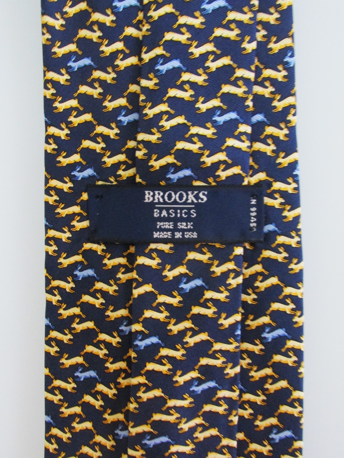 Description: Up for sale is a Brooks Brothers men's silk tie. The tie is handmade in the USA of 100% silk. The tie has a small rabbit motif in light blue yellow on a navy blue background. Dimensions are approximately 58" long x 3 5/8" wide. This tie is in excellent condition.
