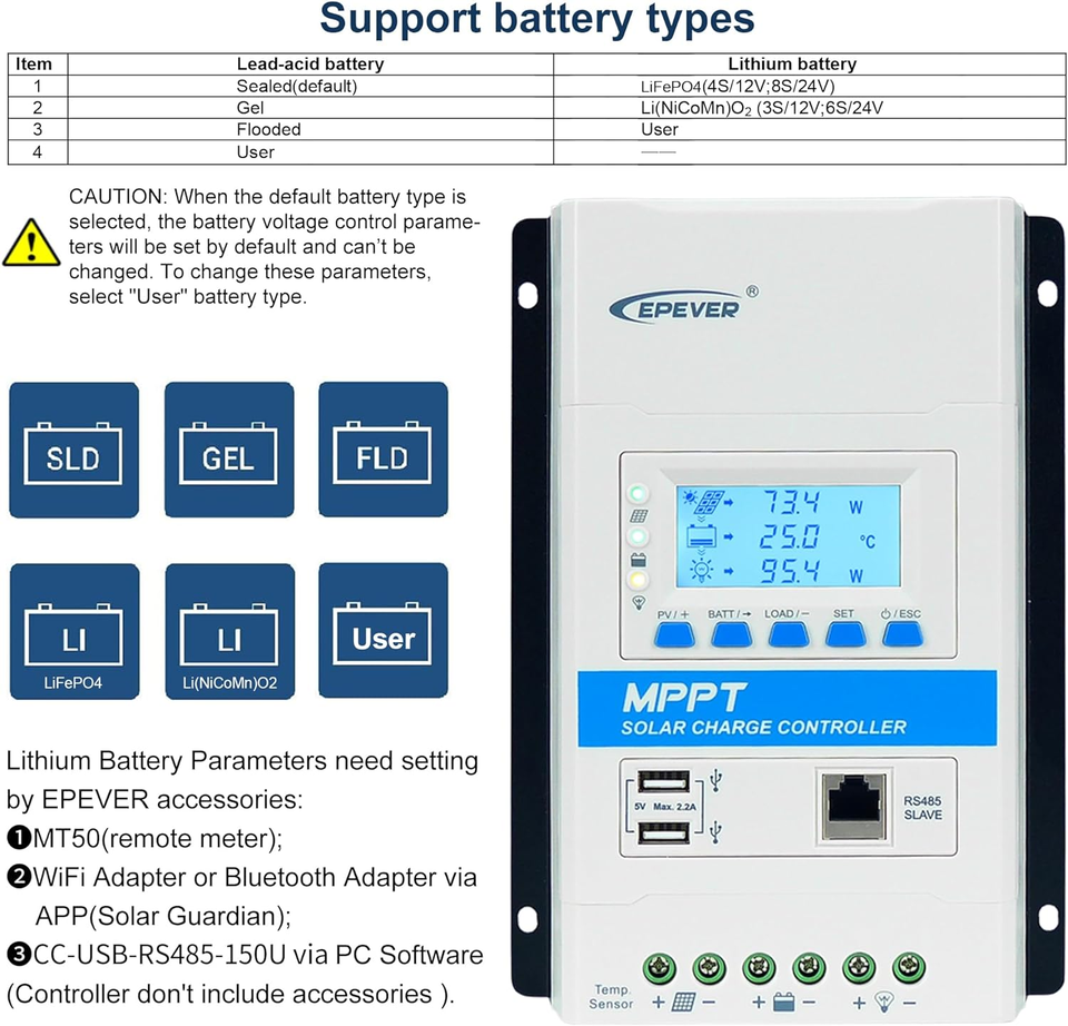 (Upgraded version) Multiple battery types selection: Lead-Acid: Sealed, Gel(AGM), Flooded; Lithium: LiFePO4 (4s/12V; 8s/24V), Li (NiCoMn)O2 (3s/12V; 6s/24V) and User-defined. Dual 5V DC USB output interface of this mppt controller can charge your electronic devices directly.