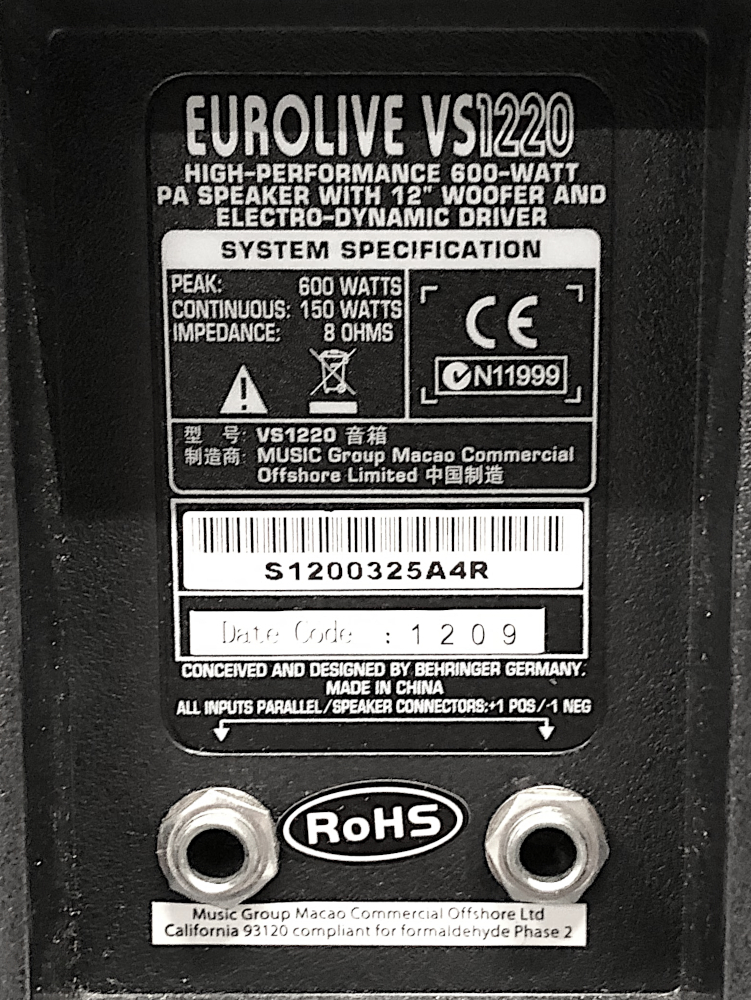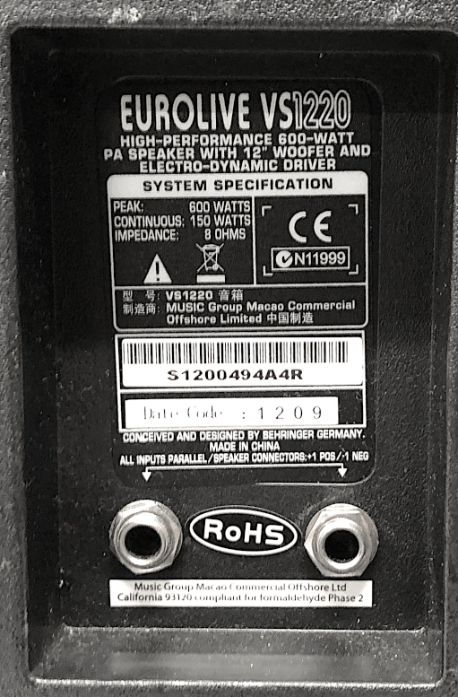 Type: PA SpeakersBrand: BehringerModel number: VS1220Color: BlackSize: 1x12"Watts: 600Model name: Eurolive VS1200Use type: ProfessionalCondition:UsedNotes:1X12" 600W