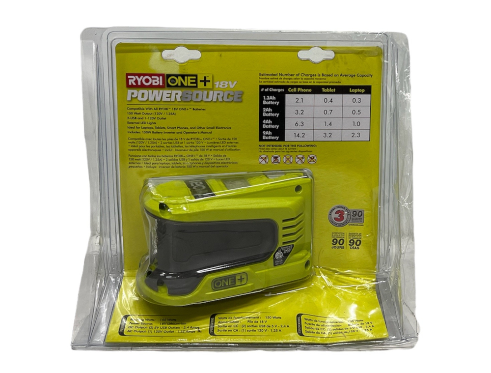 Category: Cordless hand toolsType: InverterBrand: RyobiModel number: RYi150BGSize: 150WColor: GreenPower source: BatteryBattery Included: noCase included: noCharger Included: noVoltage: 18VCondition:New (Open Box)Notes:Power Source provides convenient, on-the-go power both on and off the jobsite. With a modified sine wave and 150-Watt of continuous output, this inverter is perfect for powering laptops, tablets, cell phones and other small electronics. This compact and lightweight design is compatible with all of your existing Ryobi One batteries making endless power even easier. Equipped with 2 USB outlets and one 120-Volt wall outlet for convenient and reliable power.