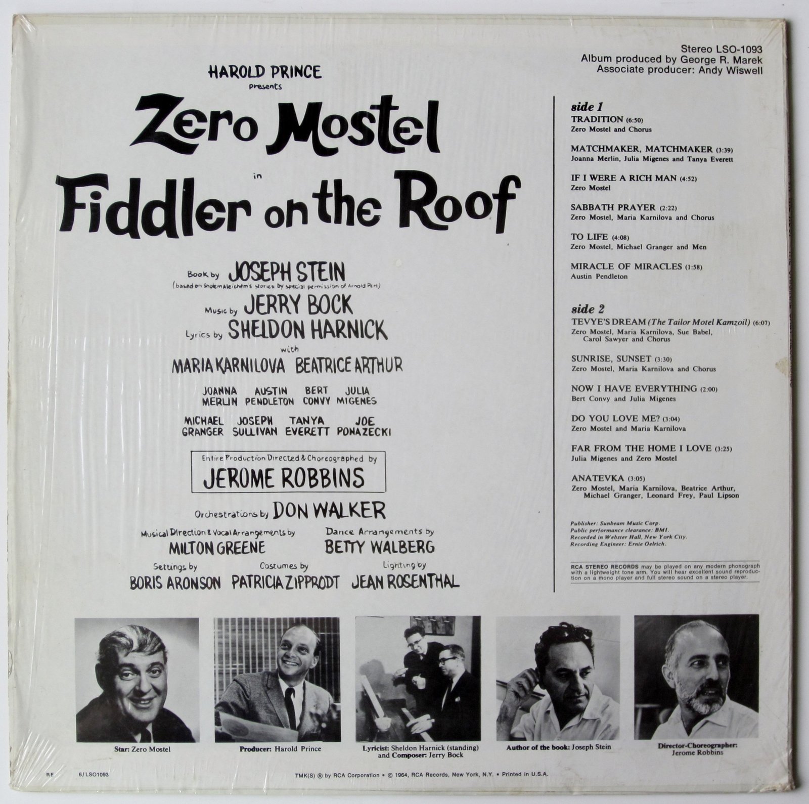 Product description: Various ?? Zero Mostel In Fiddler On The Roof (The Original Broadway Cast Recording) RCA Victor ?? LSO-1093 Vinyl, LP, Album, Stereo US 1964 Stage Screen Musical Tracklist A1?Zero Mostel And Chorus*Tradition6:50 A2?Joanna Merlin, Julia Migenes And Tanya EverettMatchmaker, Matchmaker3:39 A3?Zero MostelIf I Were A Rich Man4:52 A4?Zero Mostel, Maria Karnilova And Chorus*Sabbath Prayer2:22 A5?Zero Mostel, Michael Granger And Men*To Life4:08 A6?Austin PendletonMiracle Of Miracles1:58 B1?Zero Mostel, Maria Karnilova, Sue Babel, Carol Sawyer And Chorus*Tevye's Dream (The Tailor Motel Kamzoil)6:07 B2?Zero Mostel, Maria Karnilova And Chorus*Sunrise, Sunset3:30 B3?Bert Convy And Julia MigenesNow I Have Everything2:00 B4?Zero Mostel And Maria KarnilovaDo You Love Me?3:04 B5?Julia Migenes And Zero MostelFar From The Home I Love3:25 B6?Zero Mostel, Maria Karnilova, Beatrice Arthur, Michael Granger, Leonard Frey, Paul LipsonAnatevka3:05 Companies, etc. Recorded At ? Webster Hall Mastered At ? RCA Studios Pressed By ? RCA Records Pressing Plant, Rockaway Published By ? Sunbeam Music Corp. Copyright (c) ? Radio Corporation Of America Credits Author [Of The Book] ? Joseph Stein Composed By ? Jerry Bock Conductor ? Milton Greene Directed By [Music], Arranged By [Vocals] ? Milton Greene Engineer [Recording] ? Ernie Oelrich* Lyrics By ? Sheldon Harnick Orchestrated By ? Don Walker (3) Painting [Front Cover] ? Morrow* Performer [Star] ? Zero Mostel Producer [Album Associate] ? Andy Wiswell Producer [Album] ? George R. Marek Producer [The Musical], Presenter ? Harold Prince Notes 1964, Radio Corporation This is the RCA LSO-1093 STEREO lp record. The cover is excellent, showing hardly a hint of wear. The record is excellent with no visible scratches under normal light. Check my feedback to see that I sell exactly as I describe. So bid now to own this magnificent, impossible-to-find RECORD COLLECTIBLE.