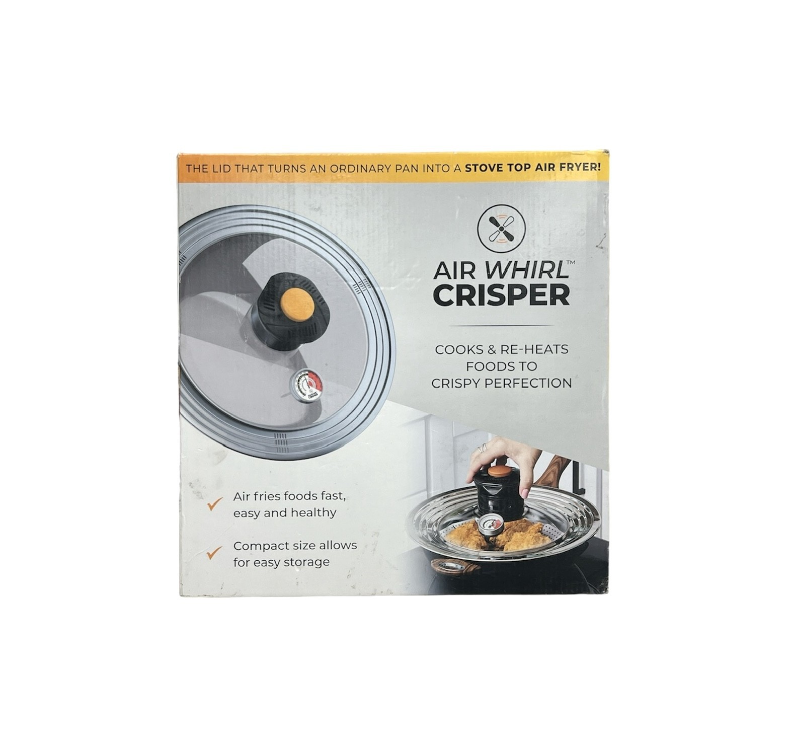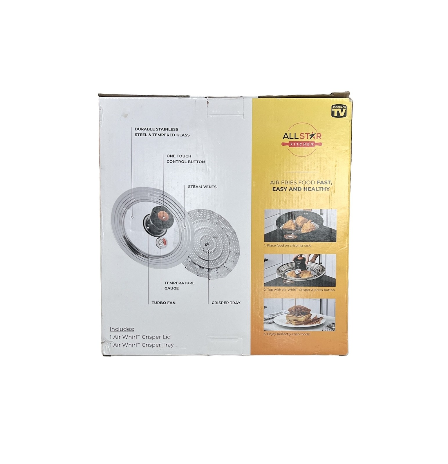 Type: Air FryerBrand: All-Star KitchenModel: Air Whirl CrisperColor: WhiteSize: 14"Condition:New (Open Box)Notes:Air Whirl Crisper Lid Stainless Steel And Tempered Glass Brand New Open Box
