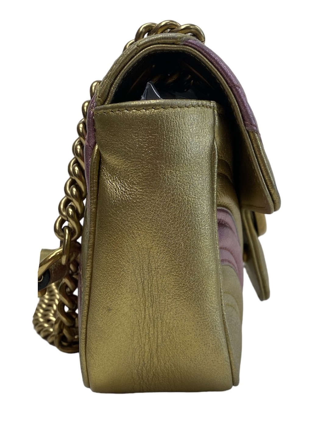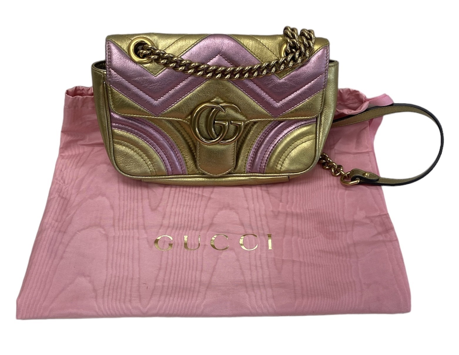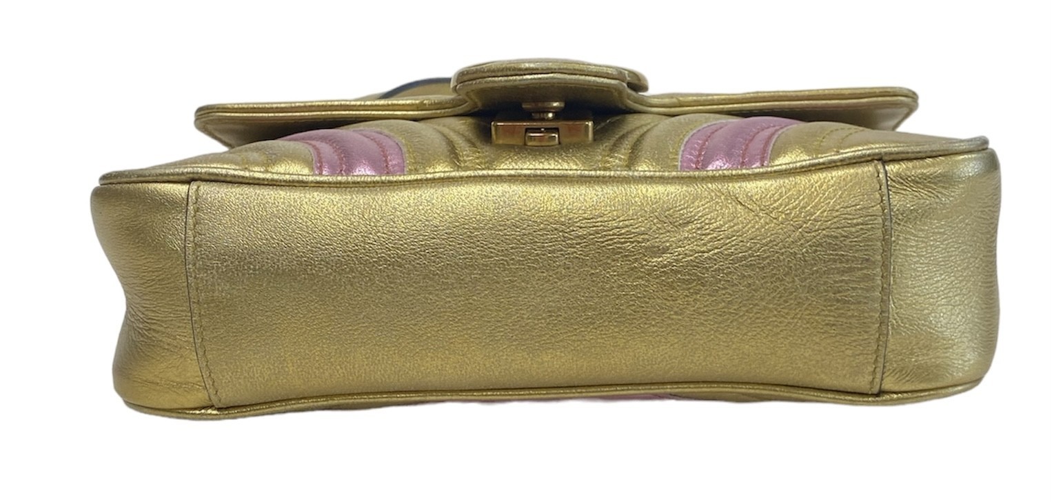 Type: PurseBrand: GucciModel name: GG Marmont Quilted CrossbodyModel number: 446744 001998Color: Gold/PinkSize: SmallBox included: noEntrupy Cert #: V2948RBCondition:UsedNotes:Some wear on the inside.