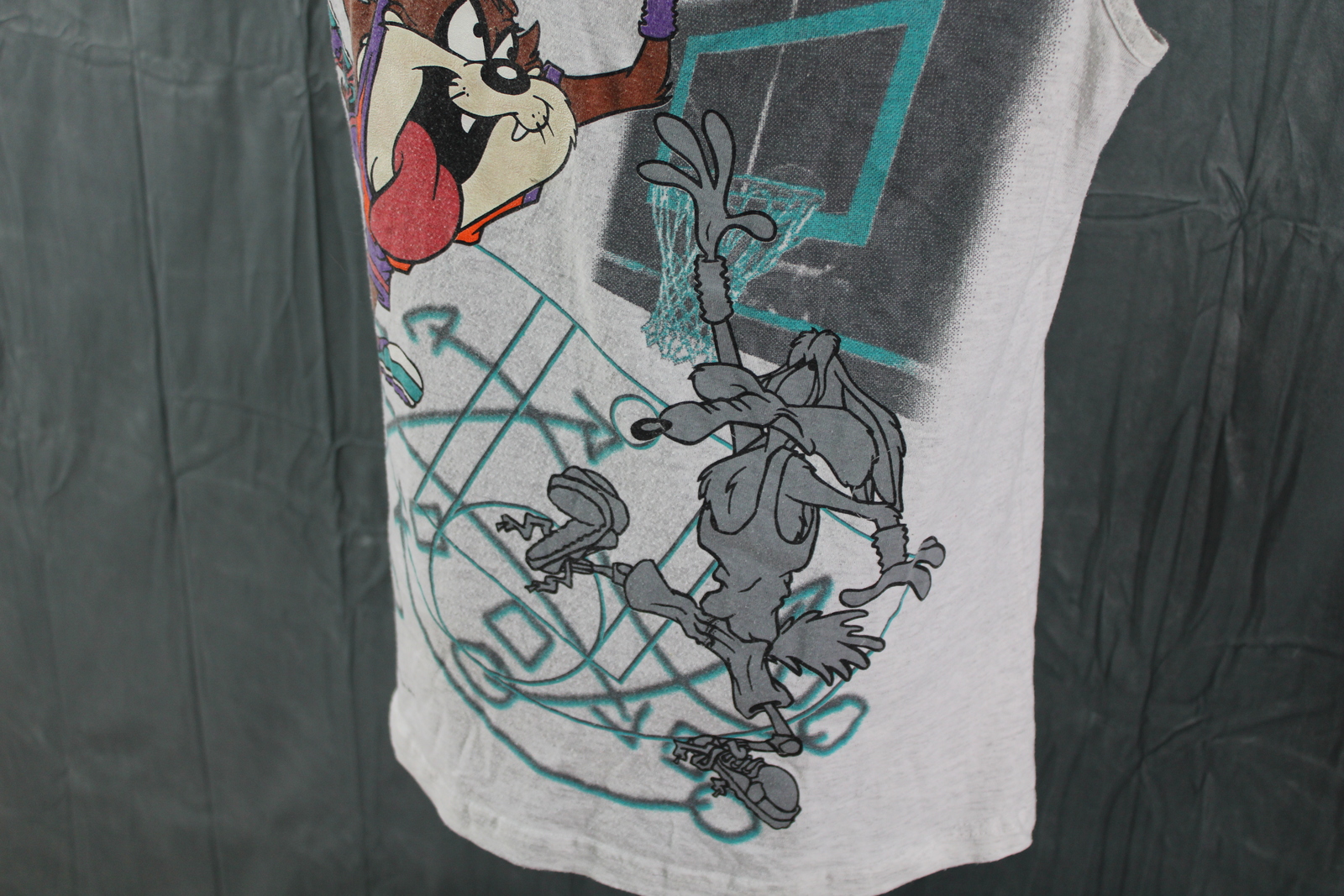Up for sale is a vintage graphic tank top. It has a grey base colour The front graphic on the tank is very large and features Taz Dunking a basketball on Wile E Coyote. The back of the tank has play to the max or not at all screened on. What a great vintage tank do not miss out on it.