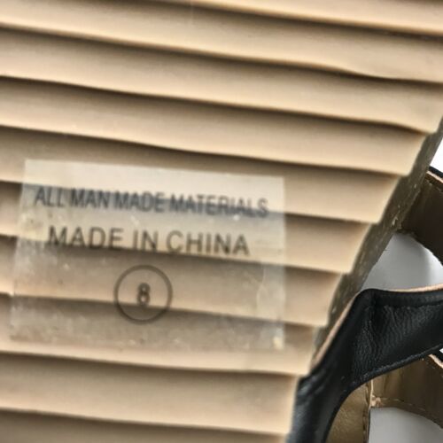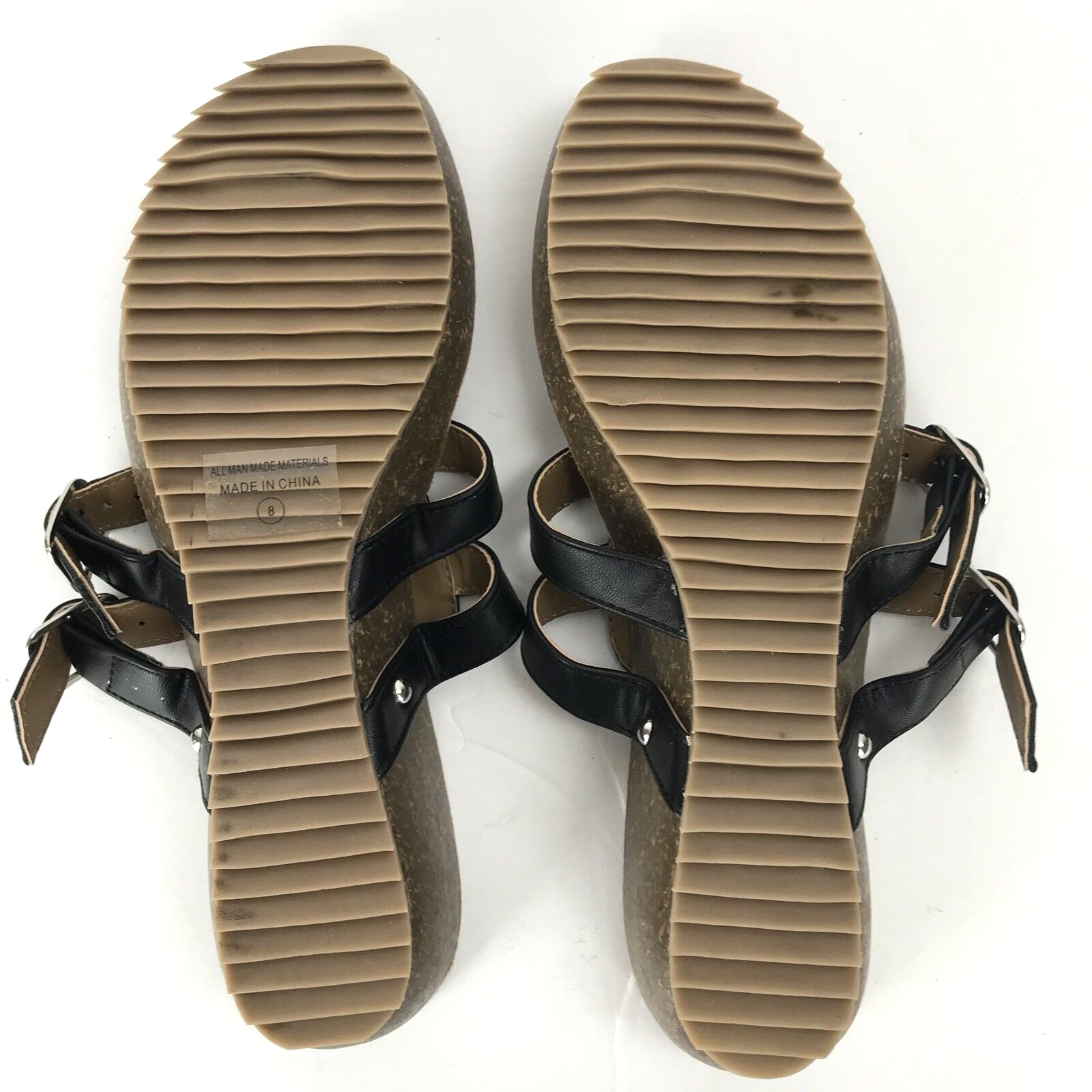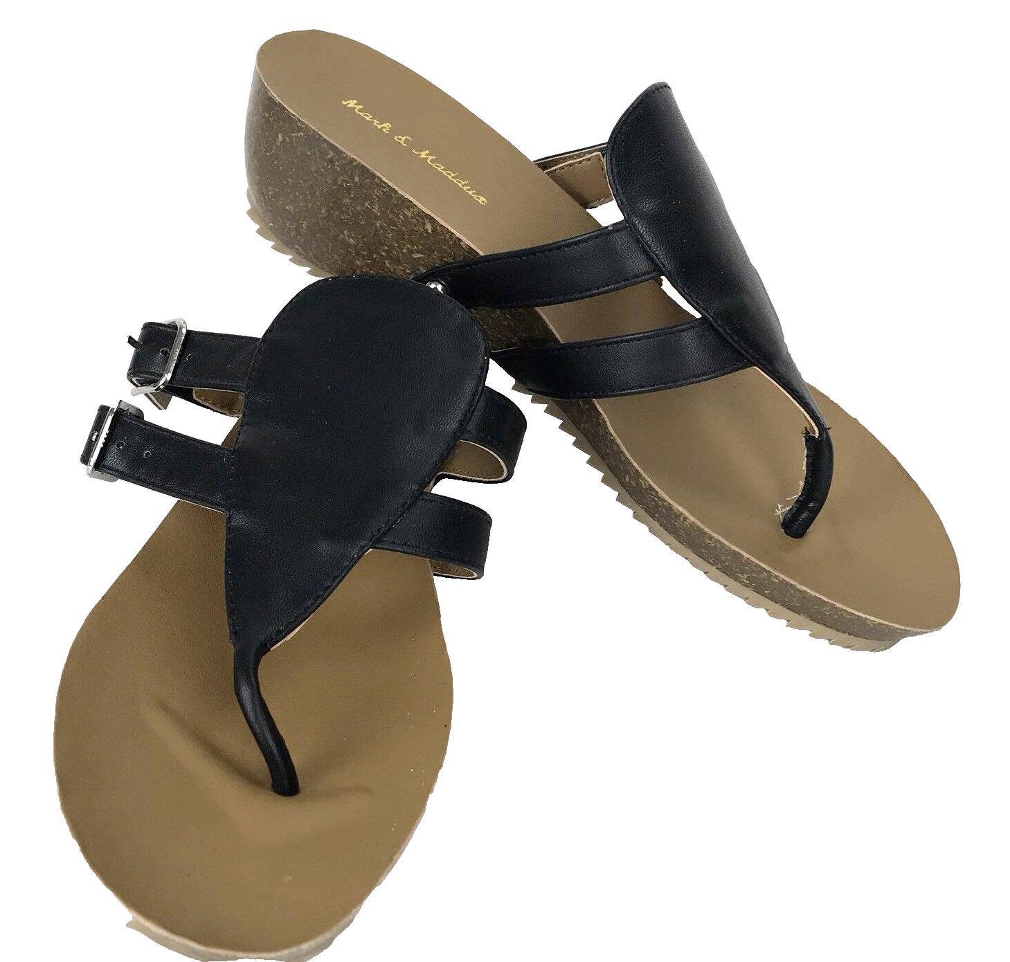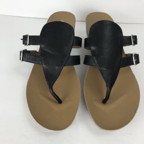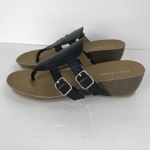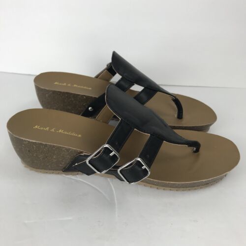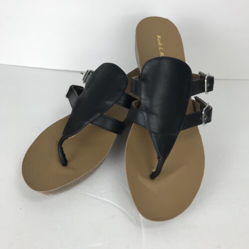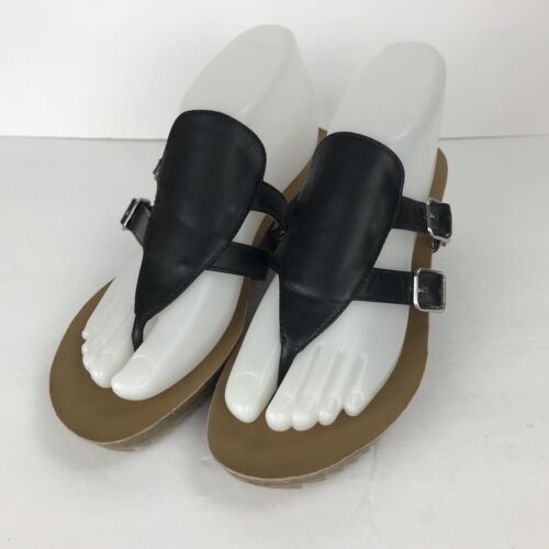 Mark & Maddux Wedge Flip Flop Black Leather Size 8 Double Buckle Sandal Shoe