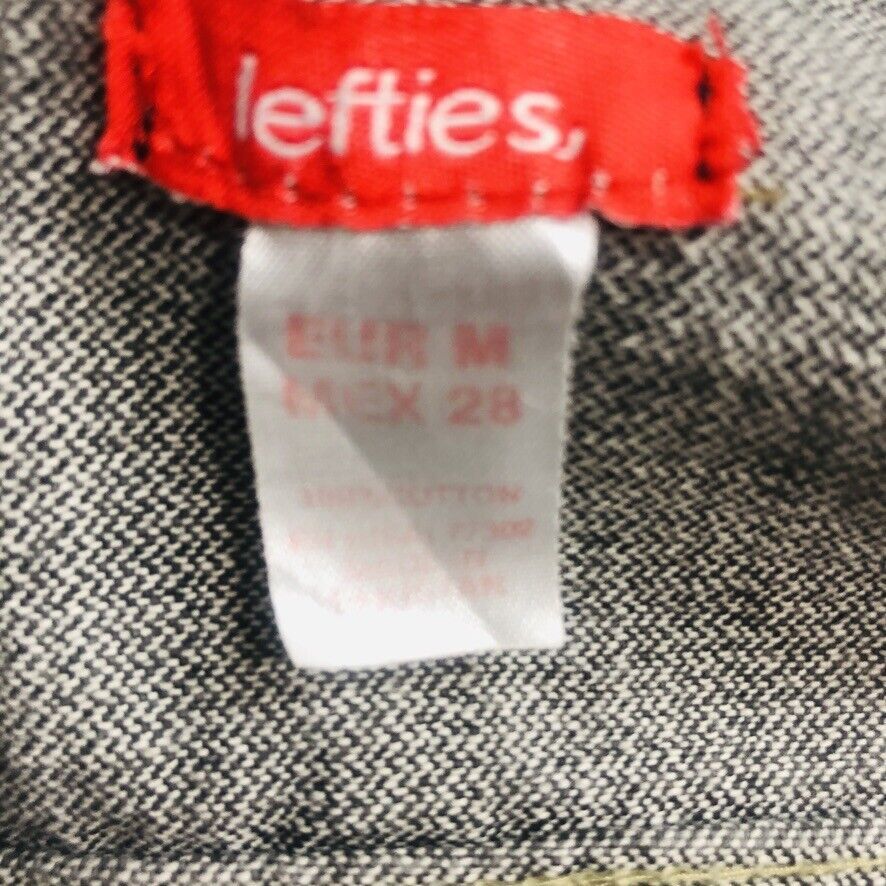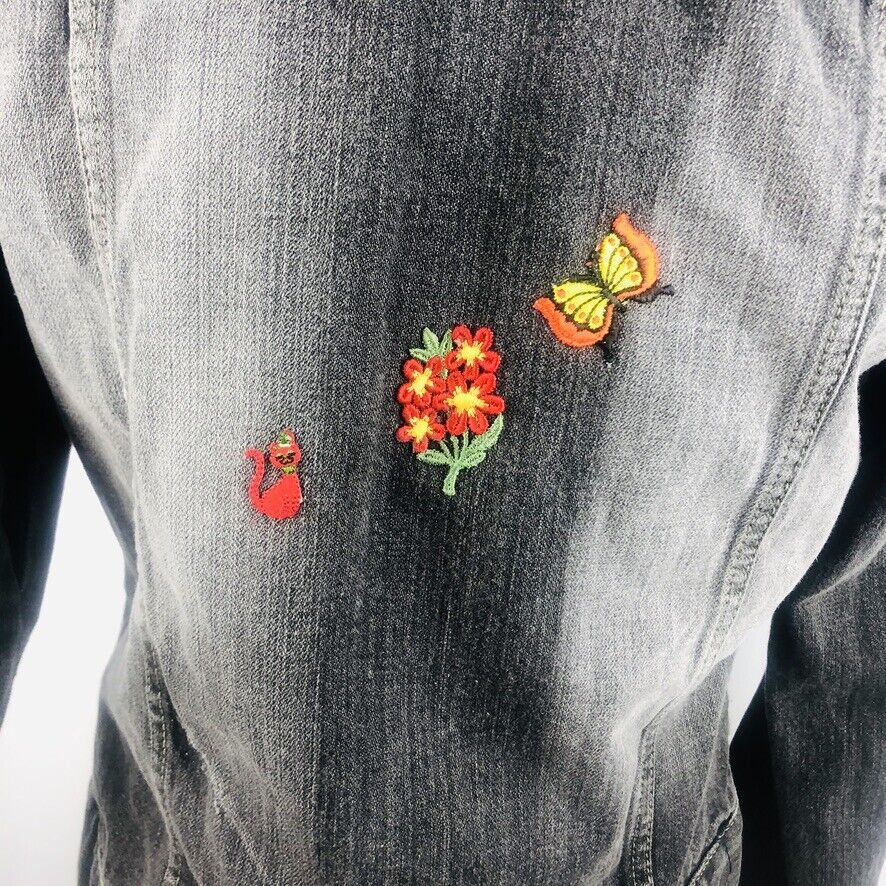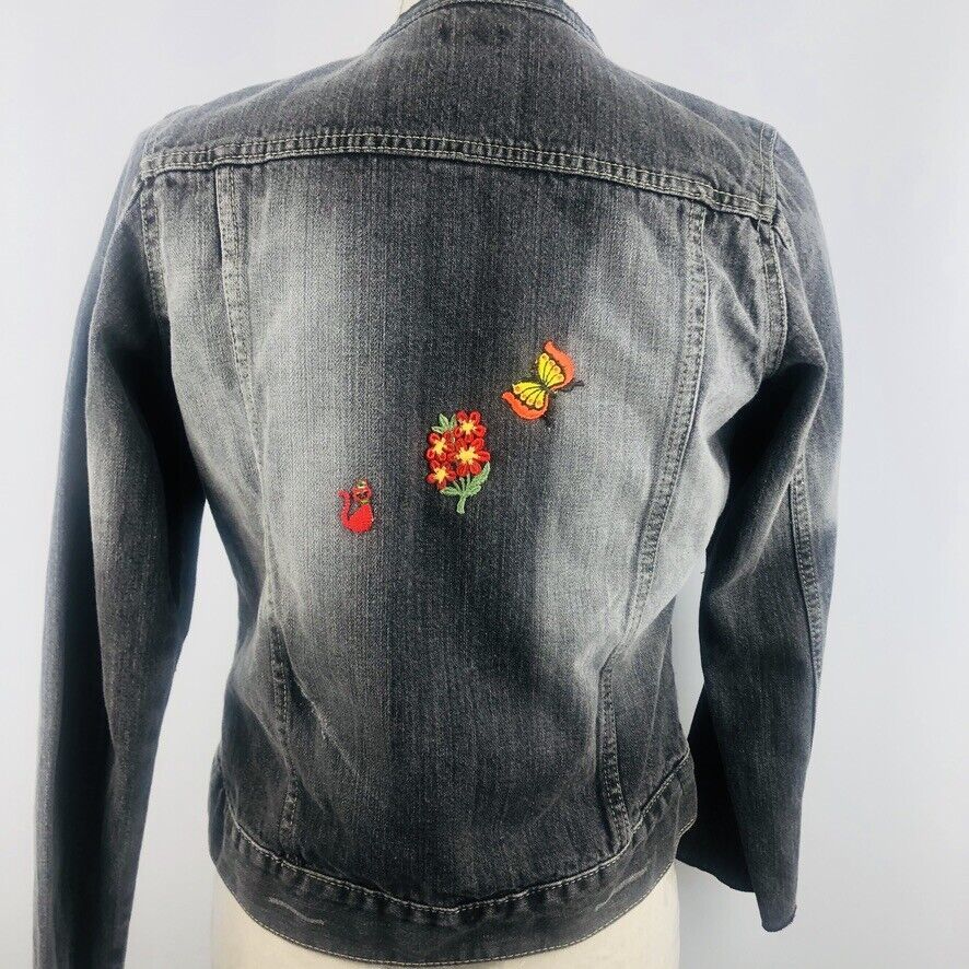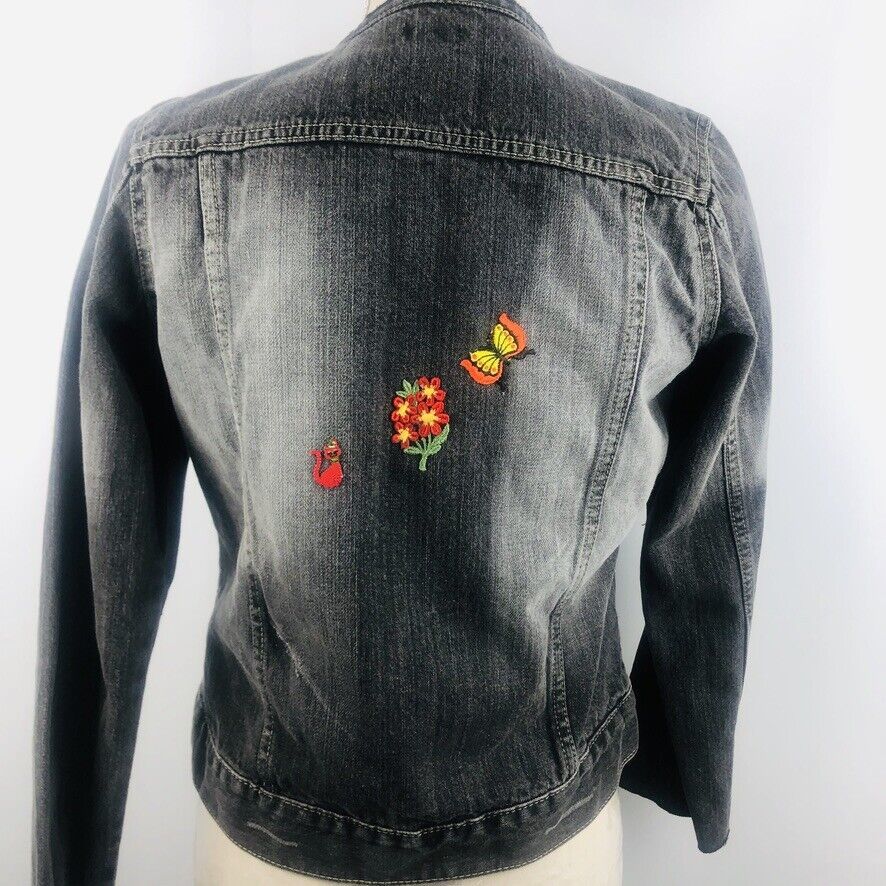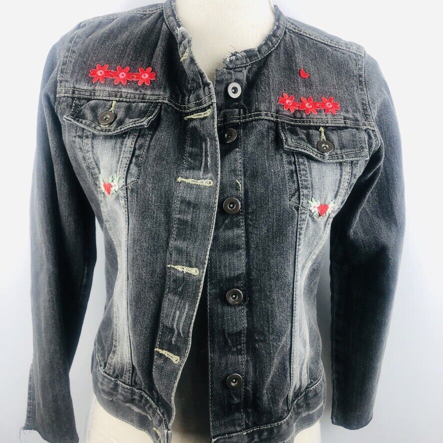 Lefties Black Denim Jacket Collarless Trucker Jean Red Flower Heart Embellished